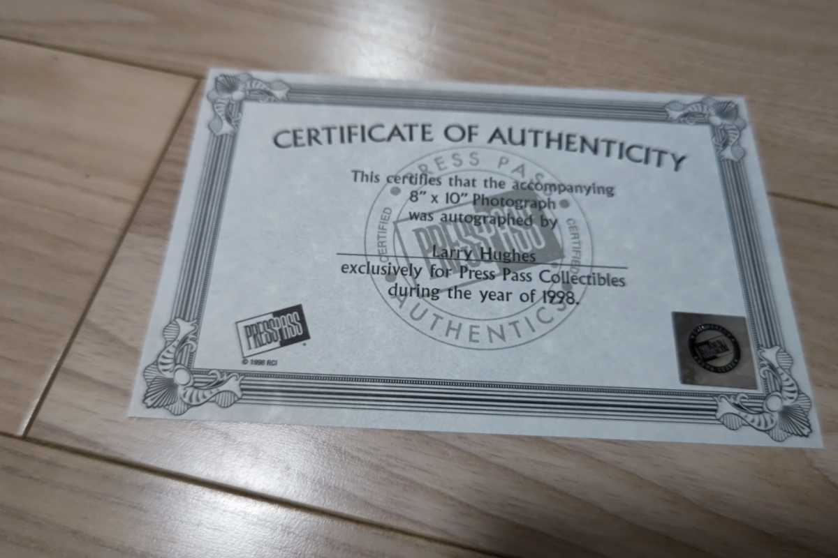 プロバスケットの最高峰のNBAのワシントン・ウィザーズなどでシューティング・ガードとして活躍したラリー・ヒューズの直筆サイン入り写真、サイズは20センチ×25センチくらいです。PRESS PASSの証明書付きです。PRESS PASSのNBAのスポーツカードを購入した時のBOX購入特典でついていたものです。