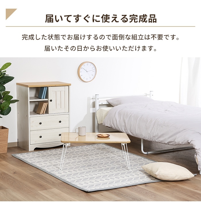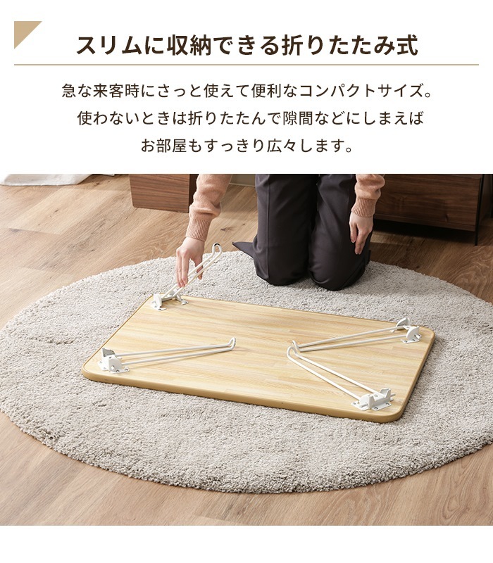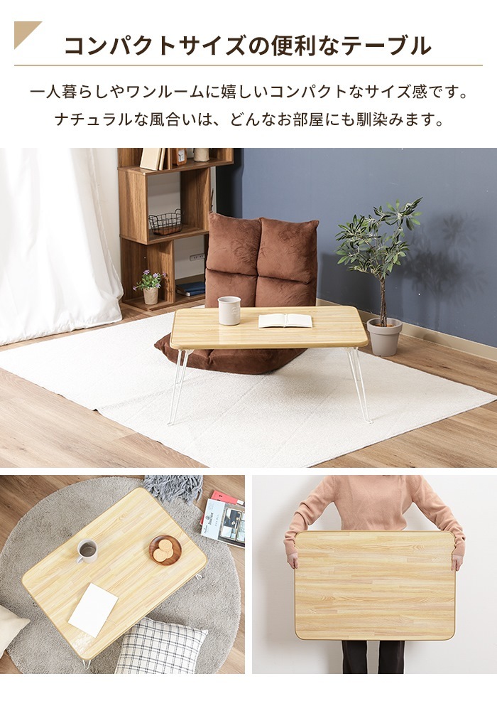 | 折りたたみ可能なので使わない時には省スペースに収納できるローテーブル。 お部屋を広く使うことができ、ひとり暮らしやワンルームの方にもオススメです。 お部屋に馴染みやすいシンプルなデザインです。 2サイズ展開でお部屋の広さ、使用目的に合わせたサイズを選ぶことができます。 |