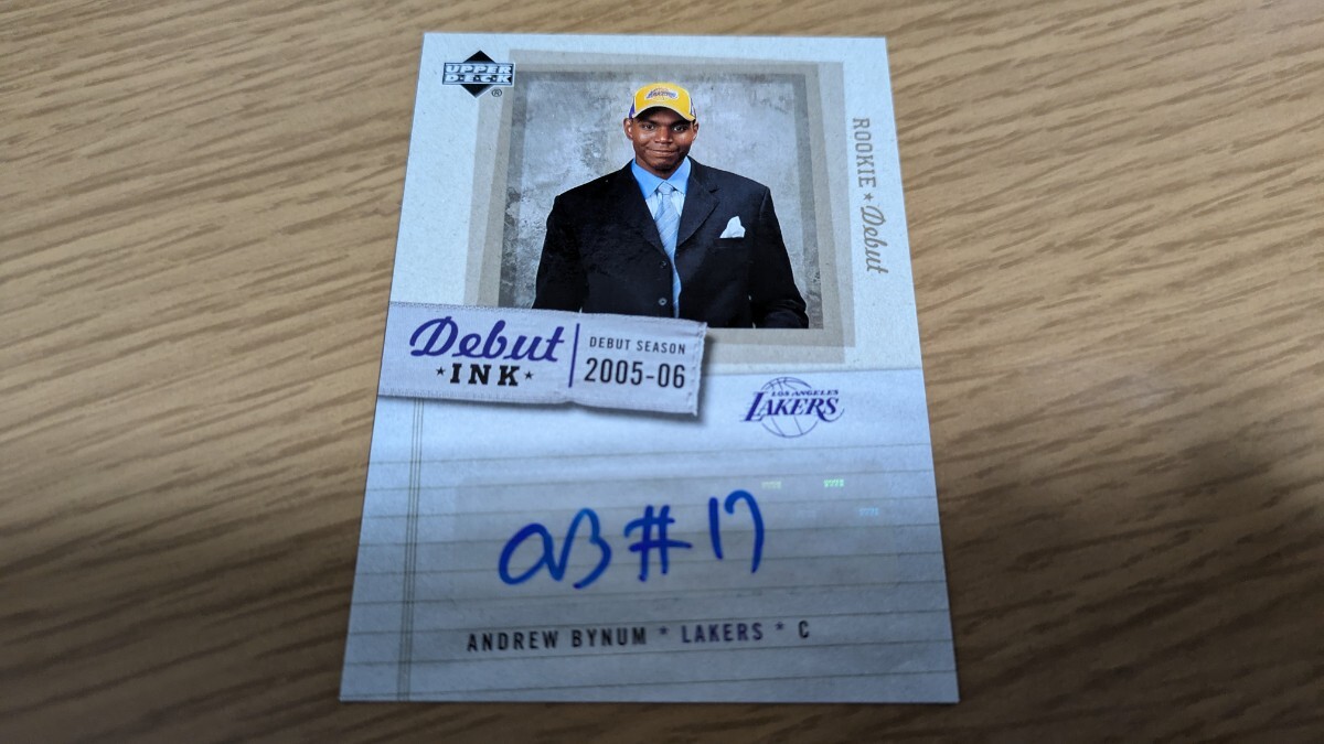 アメリカ4大スポーツのひとつNBAのロサンゼルス・レイカーズのセンターポジションで活躍したAndrew Bynumの直筆サインカード。カードはUpper Deckより出されたカードです。