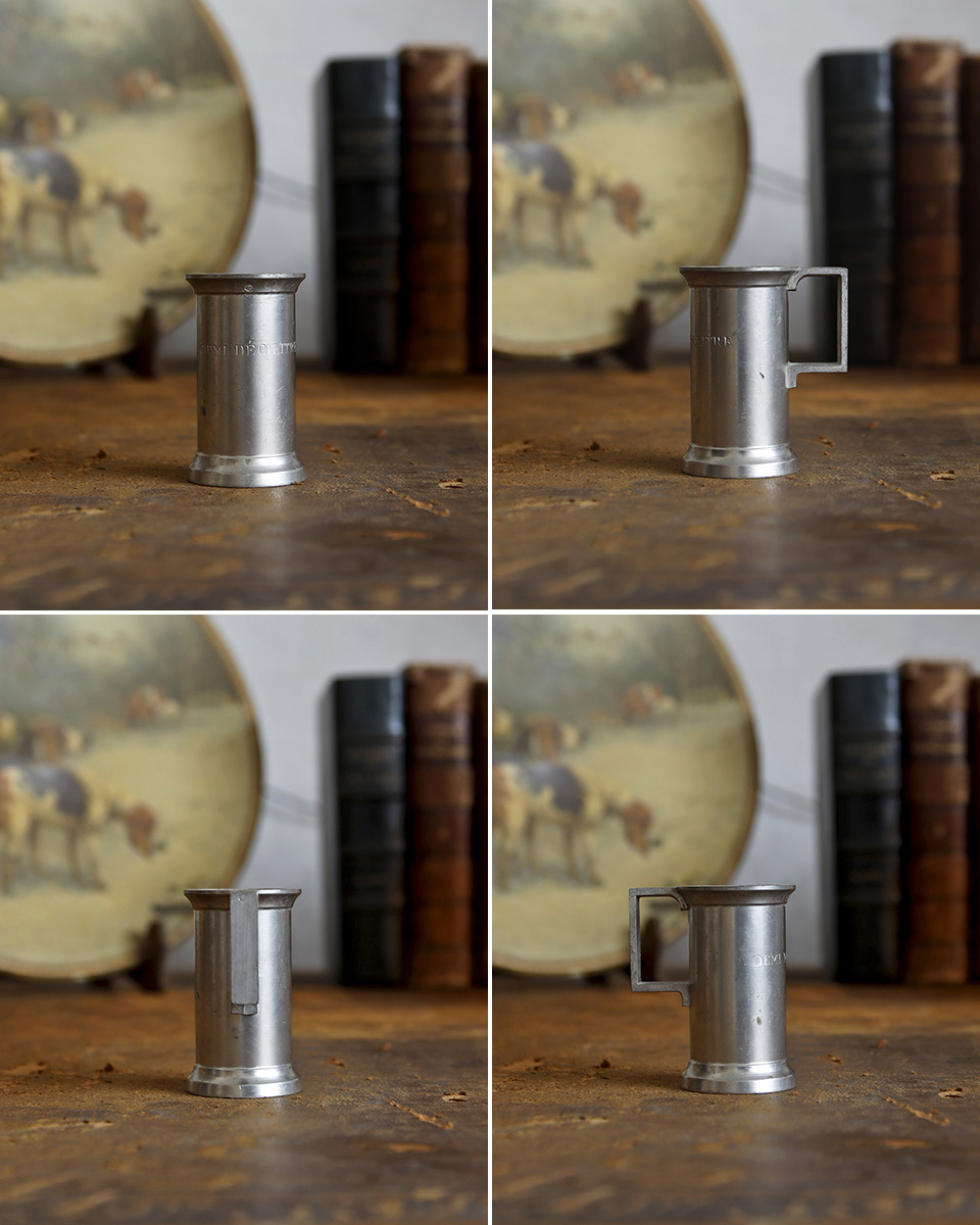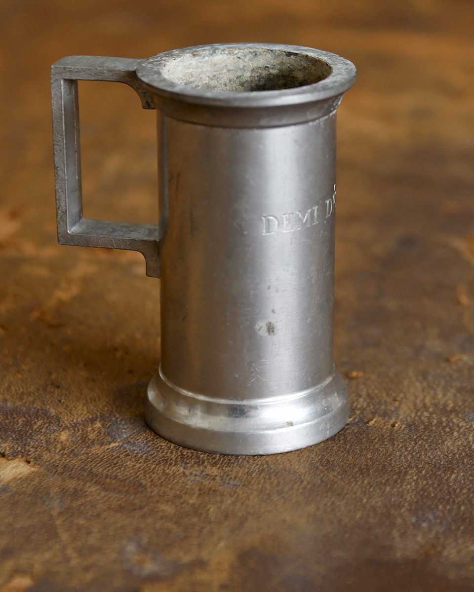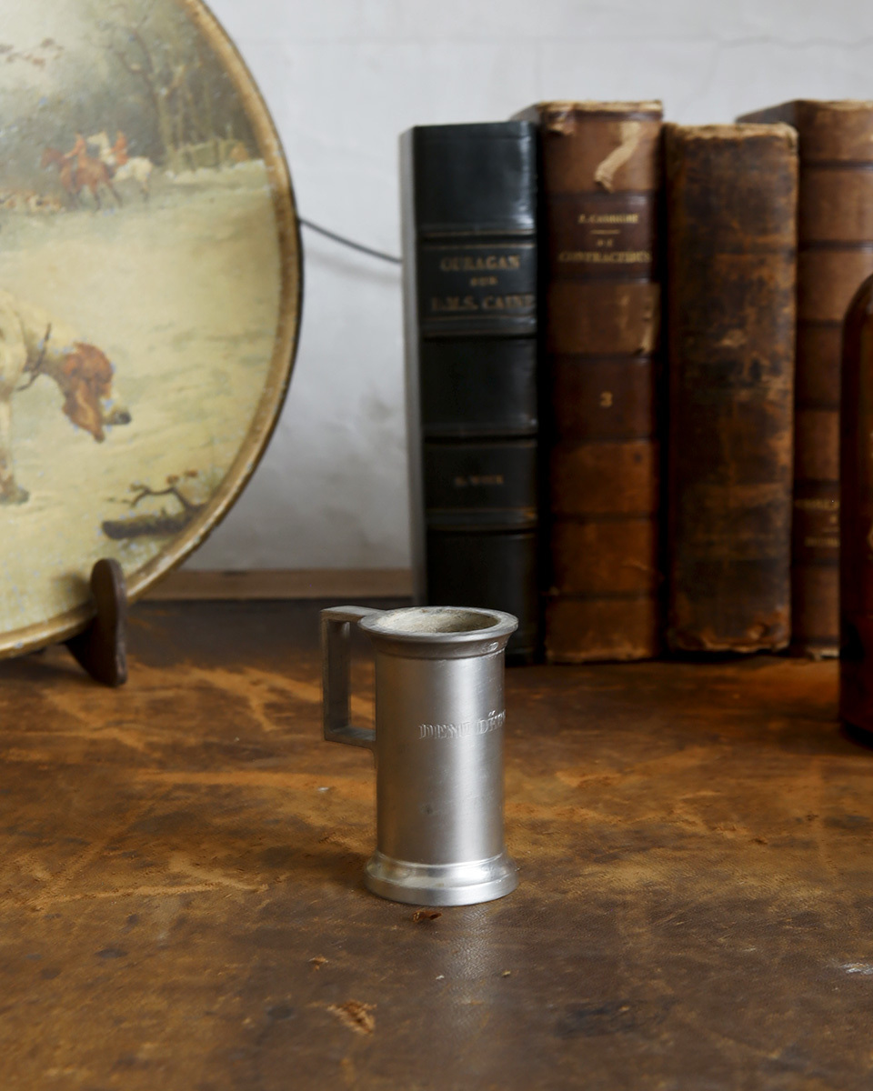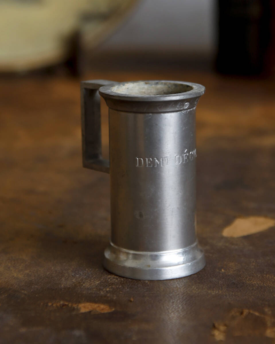 From : France 1887年創業のフランスの老舗メーカー ”JEAN ROUSSEL PARIS”社のピューター製 メジャーカップです。 フランス語でエタン(ETAIN)とも呼ばれるピューターの素材は 中世のヨーロッパでは高価なシルバーの代用品として 庶民の間で広く使われており、薬剤やお酒などを計る 計量カップとして使われていました。 すっきりとしたシルエットに"DEMI DECILITRE"(50cc) の文字がスタイリッシュな印象を感じさせ また、使い込まれたピューターの独特な風合いは 経年とともに深みを増し、より一層魅力的な 雰囲気を纏っていきます。 そのままディスプレイするのはもちろん、しっかりと重みも あるので、フラワーベースやペン立て、雑貨小物を収納する 容器としてもお勧めです。 裏には ”J.R" (JEAN ROUSSEL PARIS)の刻印がございます。 実際にお使いいただく際の衛生面での保証はいたしかねますため ディスプレイ品としてのご使用をお勧めしております。 商品はアンティーク品のため、お写真では伝わり 難い色褪せや汚れ、小傷や歪み、錆や凹み跡などがございます。 アンティークならではの風合いとしてお楽しみくださいませ。 また、追加のお写真をご希望の方はお気軽にお問合せくださいませ。 |