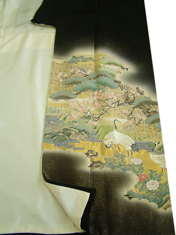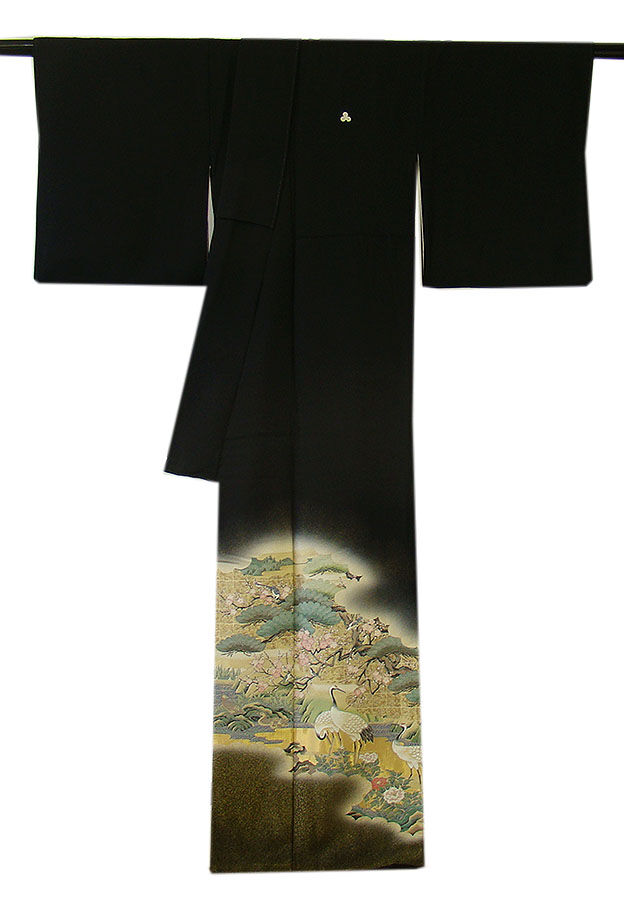 ※金彩加工染の黒留袖です。 新郎新婦のお母様や、お仲人さんにぴったりでしょう。 日本情緒の趣が匂いたち繊細に染成した見る人を魅了する品物です。 40代~70代迄幅広く着用出来ます。身長154cm~160cmの貴女に最適です。 |