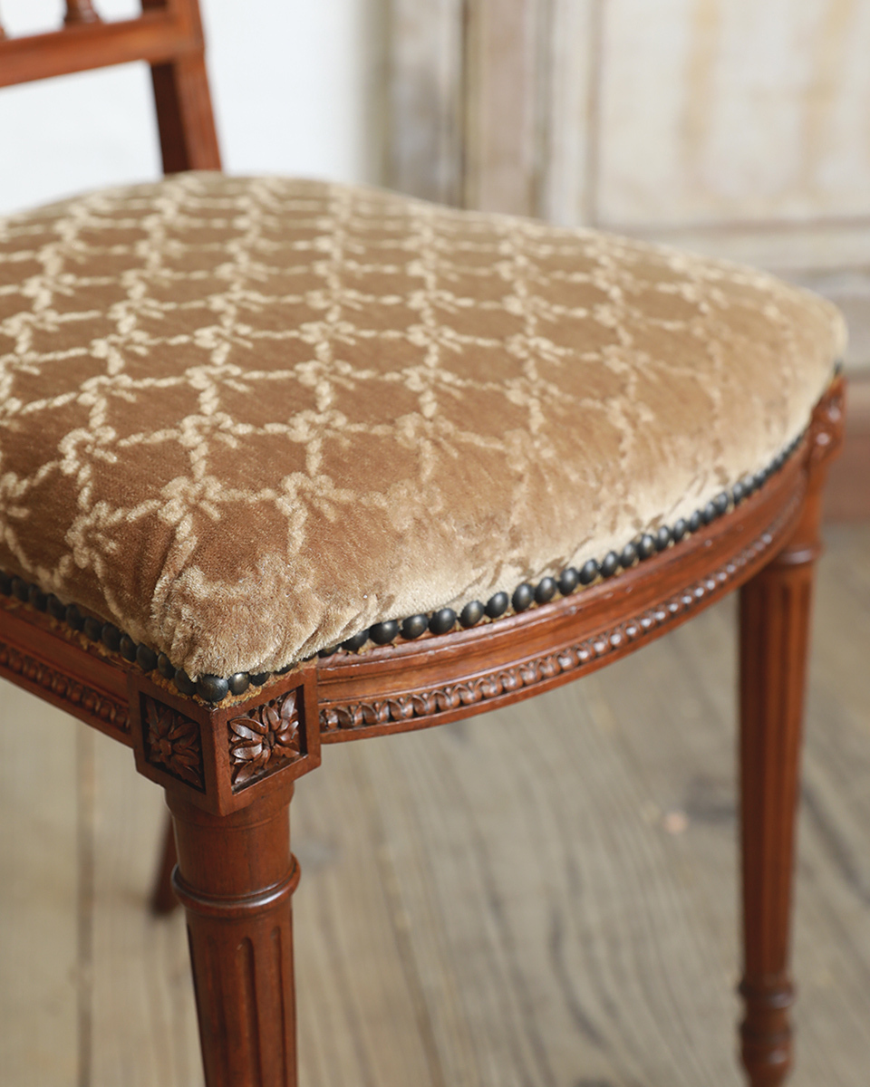 From : France (1880s) フランスアンティークらしい繊細な装飾が美しいルイ16世様式のサロンチェア。 優雅な曲線を描くフレームに配われた立体的なリボンモチーフの彫刻や、その小口にまで彫り込まれた美しい植物やパネルの彫刻にクオリティーの高さを伺えます。また背もたれの支柱や脚にはフルーティングと呼ばれるストライプ状の彫刻が施され、ルイ16世様式らしい気高さと格式高い雰囲気を纏ったひと品。 座面のダイヤ柄のファブリックが端正な佇まいのフレームと相性が良く、類稀なる存在感で高級感をいっそう引き立てます。 同じデザインで状態違いのものが4脚ございます。 座面のファブリックは入荷時の状態となります。 現状でもご使用いただける範囲ではございますが、古いもののためファブリックにシミ汚れや押し跡、解れなどが見受けられます。 また内部のクッションに多少のへたりがございます。 生地の張り替えをご希望される方は別途有料(8,000円~)にて承ります。詳細につきましてはお気軽にお問合せくださいませ。 商品はアンティーク品のため、お写真では伝わり難い色褪せや小傷などがございます。追加のお写真をご希望の方はお気軽にお問合せくださいませ。 商品はメンテナンスを施してからの発送となりますので、お届けまでに7日間ほどお時間をいただく場合がございます。 お急ぎの方はお気軽にご相談くださいませ。 |