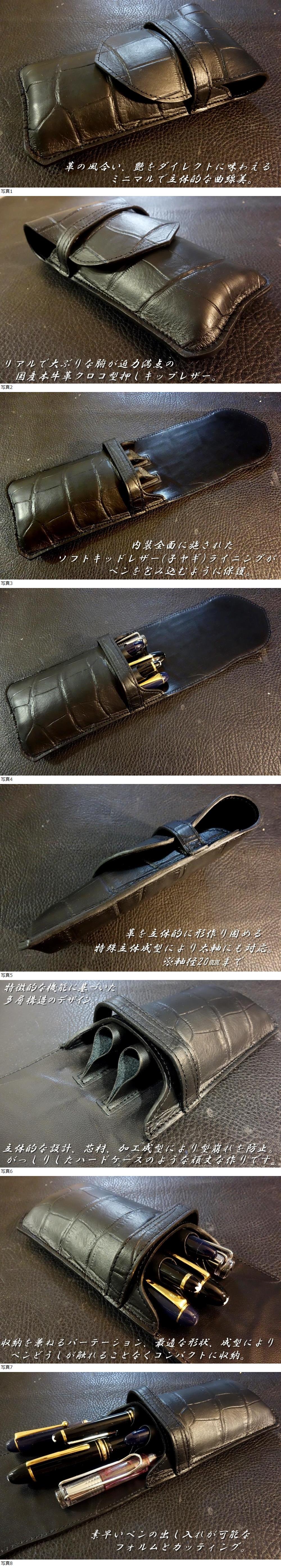 | ◆フルレザーフラップド万年筆ケース◆高品質国産本牛革クロコ型押しキップレザー 立体成型 BLACK 5本挿し 太軸対応 日本製 |