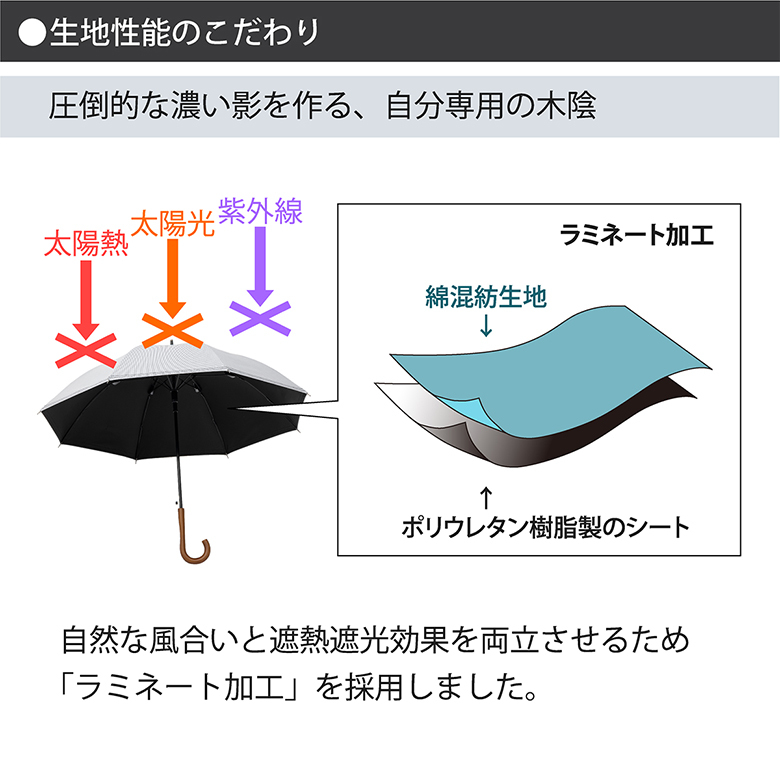 遮光長傘 クールプラス ステッチ 55cm ブラック| ■以下の点をご確認の上お買い求めください。 1.生地の検査結果は「遮光率100.00%」となりますが、一般財団法人カケンテストセンターの見解の通り「完全遮光」を意味するものではありません。商品添付のタグ表示には「1級遮光生地使用、遮光率99.99%以上」としています。また傘として仕上げておりますので、ミシン縫製による縫い目から光が差し込むことがあります。 2.生地の特性上、光が透けて見えるとても小さな穴(ピンホール)がある場合があります。これは製造工程上避けられないことで、ピンホールがあっても、雨が濡れることもありません。そのため僅かなピンホールは良品として販売しております。ご了承くださいませ。 3.生地に撥水加工が施してありますので、雨の日も使える晴雨兼用タイプです。ただし刺繍糸には撥水加工が施してありません。長時間の雨天でのご使用、大雨の場合は刺繍糸から水が浸みる可能性がありますのでご注意ください。また雨傘としてご使用になられた後は、乾かしてからおしまいください。 |