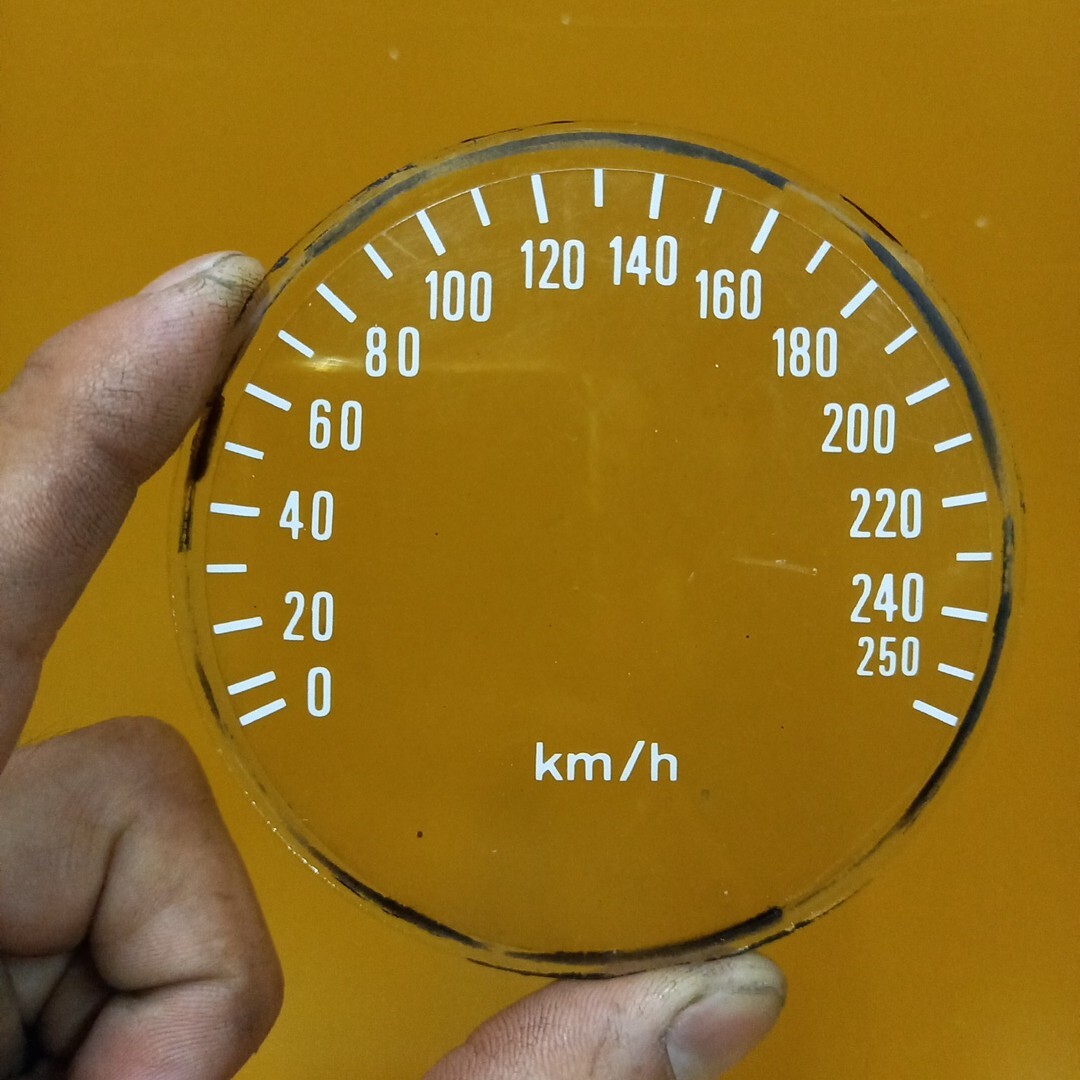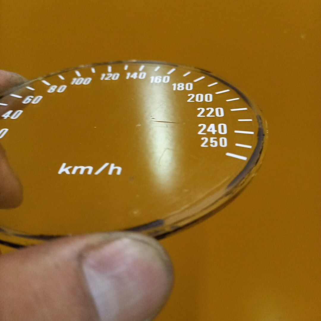 Z1より取り外しました、スピードメーターレンズです。マイルメーターでしたので、キロ表示用ステッカーが貼ってあります。レンズにワレは無さそうですが、表面のステッカーにキズや黄ばみがあります。外形88パイです。補修にいかがでしょうか。| 出价者 | 信用 | 价格 | 时间 |