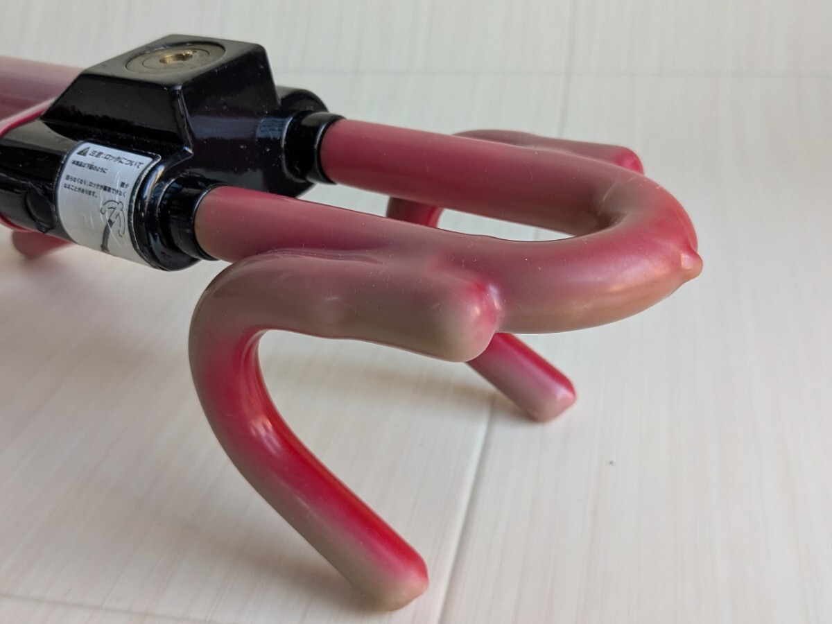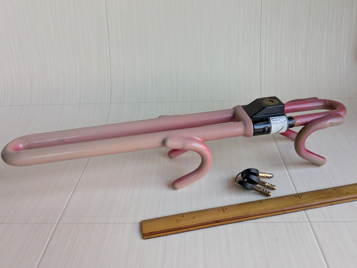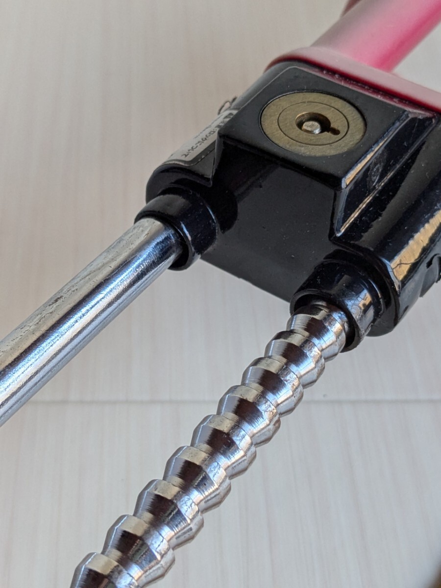 外側に向いたフックをハンドルの握る部分の内側に掛けます、キーを抜いた状態で伸ばしてピタッと密着して外れないようになればロック完了です