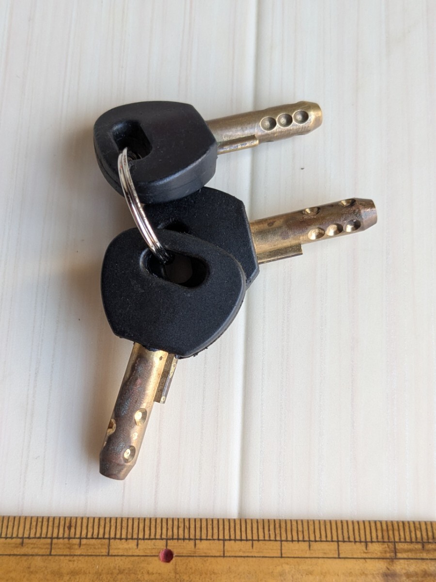 また、注意書きの赤字の部分が退色して見えなくなっていますが、ロックの位置によっては開錠用の鍵が差し込めなかったり回すことができなくなったりするので気を付けろ、と書いてあるものと思います