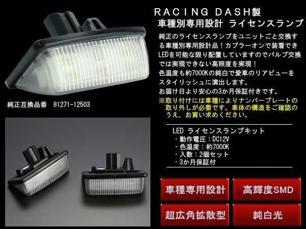 純正のライセンスランプをユニットごと交換する車種別専用設計品! カプラーオンで装着できLEDを可能な限り配置していますのでバルブ交換では実現できない高照度を実現! 色温度も約7000Kの純白で愛車のリアビューをスタイリッシュに演出します。 お届け日より安心の3か月保証付きです。 その他、レーシングダッシュ製品は⇒ こちら | ■ レーシングダッシュ型番:5604275W ■ 動作電圧:DC12V ■ 保証期間:到着日より3か月間 ■ 色温度:約7000K ■ 入数:2個セット 純正品と同様の結露の発生や少量の水滴の侵入、お客様の取り扱い上による破損及び加工改造等を行った物は保証対象外です。 保証はあくまで製品本体の保証であって、取付け工賃や製品使用から生じたいかなる損害に関しては当店は一切の責任は負いません。 | |