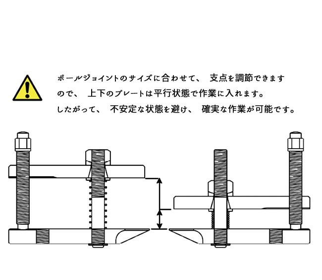 | 商品詳細 | ■商品仕様 ・全 長 : 160mm ・挿入幅 : 約32mm ・最大開口 : 58mm ・使用工具 : 19mmレンチ ・重 量 : 約1.6kg ※タイロッドエンドのシャフトに爪の奥までしっかりと挿入して使用して下さい。 ※ネジ部には作業時負担が掛かりますので、グリス等を塗って使用することをおすすめします。 ※工具および車に破損する恐れがあるためインパクトレンチのご使用は厳禁。 |