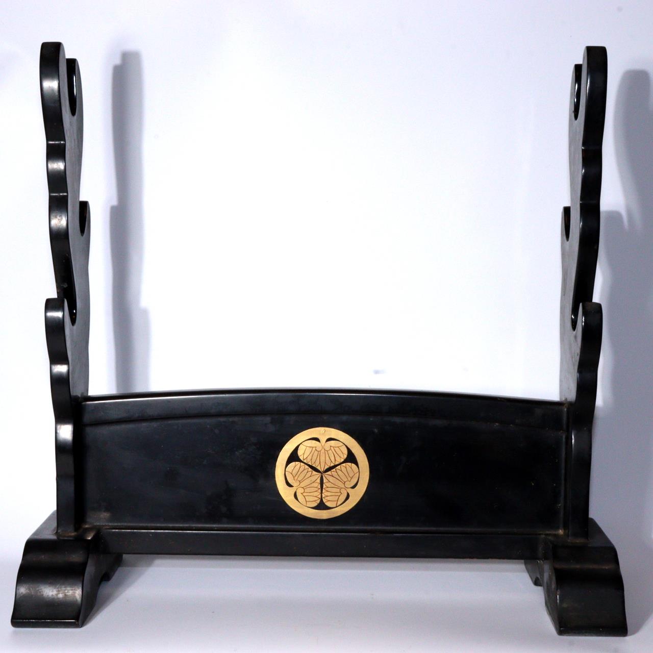 三つ葉葵、木製の刀掛けです。シンプルな構造ながら存在感があり、 日本刀や居合刀を飾るのに最適です。 ※刀は撮影用で付属しません。 ■高さ 43cm ■幅 44.5cm ■奥行 19cm ■重量 1000g 状態:小傷、スレ、漆に剥がれ、汚れ等があります。 当方は骨董品を中心に取り扱っており、安心してお取引いただけるよう丁寧な対応・梱包を心がけております。 ◆ 商品について