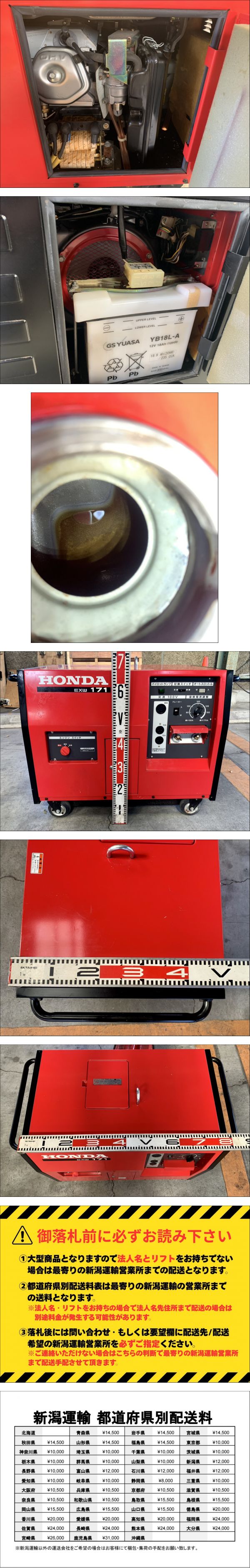 状態 | 動作確認動画YouTubeリンク ※必ず動画を参照の上、ご入札のご検討をお願いします。 ■本商品は中古品の為、傷や汚れ等があります。 ■始動、溶接、電源の確認を行いました。詳細は動画を参照してください。 ■あくまでも簡易的な確認になる為、動画をよく見て頂き少しでも不安がある方は入札をご遠慮ください。 ■付属品も含め、画像に記載されているもので全てとなります。 ■中古エンジン機械となりますので、説明・動画・画像より状態を判断できる方のみご入札下さい。 ※あくまでも現状品となりますので始動のクセ・キャブの調整等は落札者様でご対応下さい。有識者様のみ入札をお願い致します。 ■現状でのお渡しとなりますのでご利用に当たり整備・修理などが必要になる場合がございます。 ■上記の内容をしっかり理解したうえで入札してください。 ※スムーズなお取引を目指しております。下記内容を必ずご確認ください※ ・当アカウントでは、落札後の使用方法・取付方法・サポートなどは行っておりません。 ・使用方法・修理方法・お手入れの仕方など専門的な知識の無い方は入札をお控え頂きますようお願い致します。 ・現状販売の中古品になります。説明・動画・画像より状態を判断できる方のみご入札下さい。 ・神経質な方や完璧な商品を求める方の入札はご遠慮下さい。 ・商品状態のランクにつきましては出品者の主観によりますので普遍的なものではございません。 出品者と落札者様の価値観の相違がある可能性がありますのでご了承いただくと共に、出品ランクに対するクレームや返品・返金対応は対応しかねます。 ★直接引取可能「東静岡駅付近」 ※直接配送はリフトをお持ちの会社様に限ります、その他の場合は最寄りの新潟運輸留めとなります |