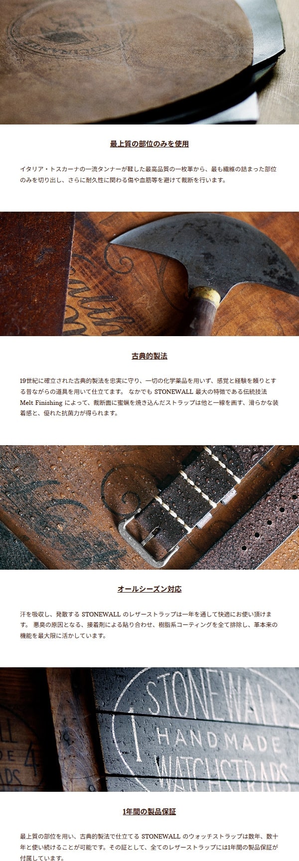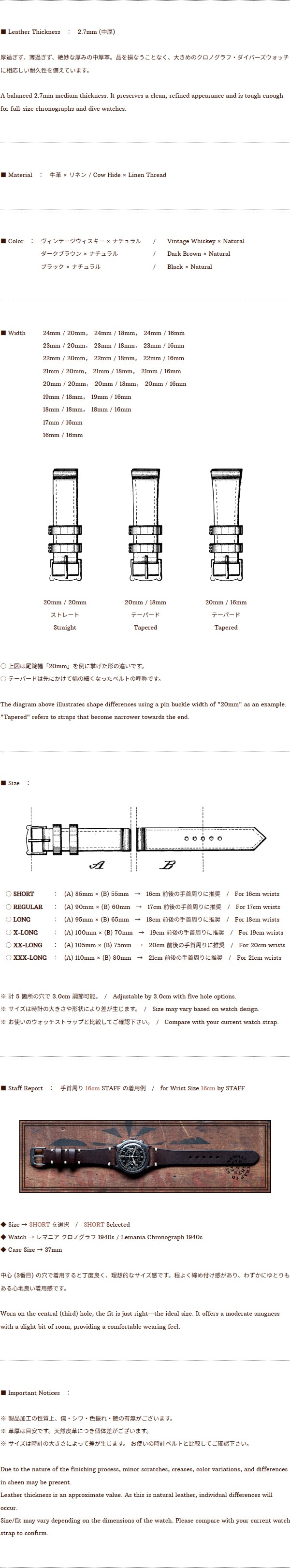 * こちらの商品はフルサイズをストックしておりますので 3日以内 に発送致します。 * 商品は1本の価格です。落札後にご希望のカラー・サイズ・ベルト幅をご連絡ください。 ストーンウォール初の製品加工を施したヴィンテージシリーズです。 1930年代に大量生産されたハンドメイドウォッチストラップを解析。耐久性は確保しつつ、古き良き手仕事の"拙(つたな)さ"をあえて再現することで、ヴィンテージの雰囲気をより高めています。 特筆すべきは、あえて拙く粗雑なつくりにすることで生産時間を短縮、さらには革本来のシワや傷が入った部位を製品の魅力として活かすことで、大幅なコストダウンが実現した点です。 ストーンウォールの耐久性と、素材はそのままに、ヴィンテージの魅力を最大限に引き出した、コストパフォーマンスにも優れたウォッチストラップです。 傷・シワ・汚れ・濃淡・刻印のずれ・大雑把な縫い等、その全てが演出であり、同商品最大の魅力であることを予めご留意願います。 やや厚みのある中厚革を使用した *ライトヘビー モデル。 大きめのクロノグラフ、ダイバーズウォッチには最適のウォッチストラップです。 尾錠にはやや重量のあるベーシックな角形を採用。 古い時計、現行時計を問わず好相性です。 形は第二次世界大戦時にアメリカ軍で採用されていたウォッチストラップをベースに、 貼り合わせのない一枚革を総手縫いで仕立てています。 同モデルでは *ウィップステッチ を採用。 先史時代に起源を持ち、様々な文化圏で何千年も使われてきた、最も原始的で洗練された縫製技術です。 革は イタリア・トスカーナ産 *アキャブ 。 "闘う男"を落とし込んだ同革は生産過程で職人がナイフで傷を付けるバダラッシ・カルロ社独自の革です。 ストーンウォール独自の製品加工を施すことで、傷・シワに陰影が加わり、かつ艶やかに変化した、ヴィンテージよりもヴィンテージの風格を帯びたウォッチストラップです。 同革は日本国内での販売は終了しており、在庫限りの販売となります。 ● ヴィンテージ加工素材の性質上、傷・シワ・色振れ・艶の有無がございます。 ● 革厚は目安です。天然皮革につき個体差がございます。 ● サイズは時計の大きさによって差が生じます。 お使いの時計ベルトと比較してご確認下さい。 ● 決済日より起算して5日後以降から配達日時指定が可能です。 ● 説明文に記載の無い点につきましては、落札前に必ずお問い合わせの上ご確認下さい。 |