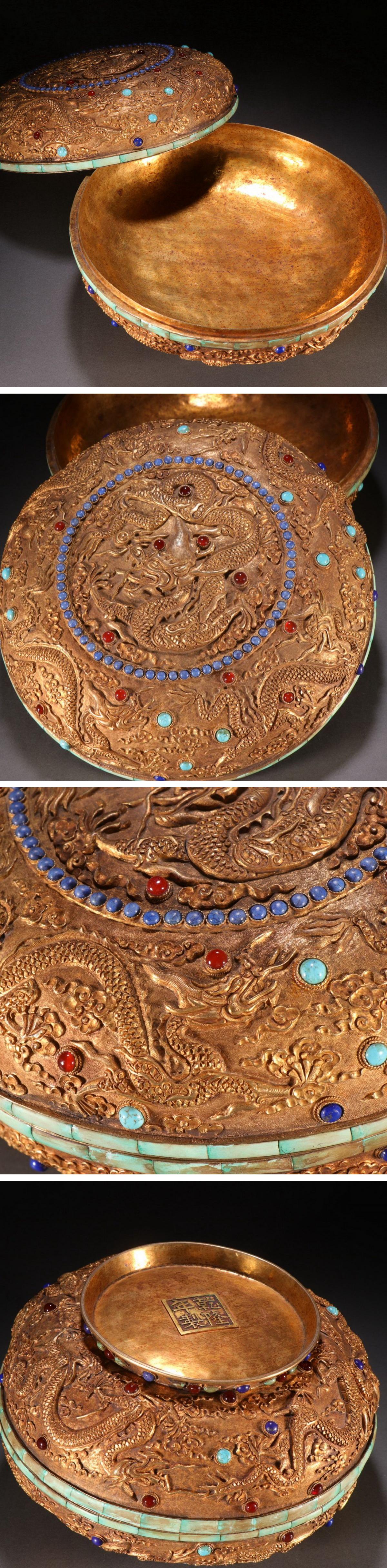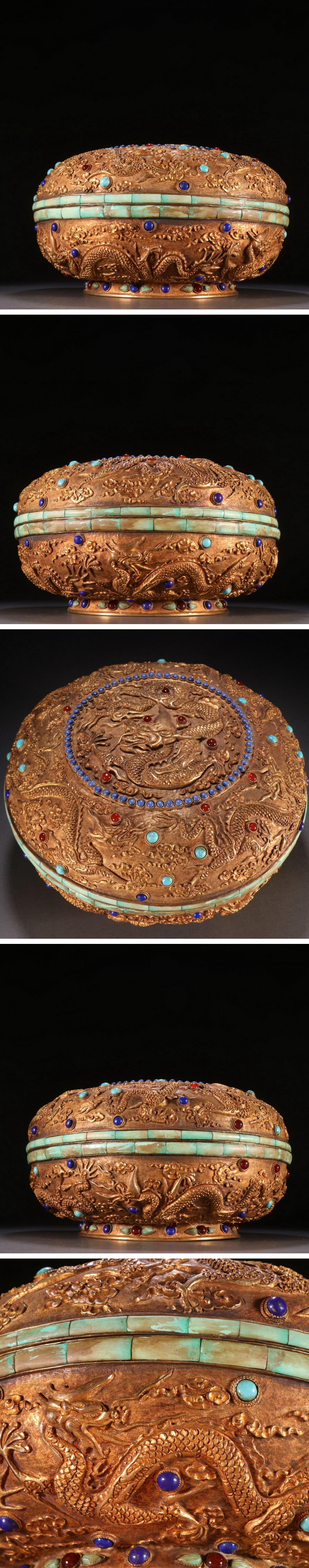 【清】某有名オークション購入 清時代 銅金 象嵌寶石 雲龍文蓋物 材質保証 古置物 古擺件 古美術 時代コレクション7L9-GT3