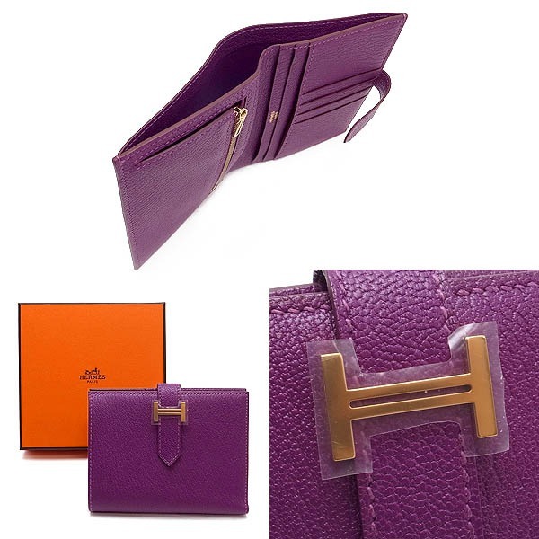 | | コメント | 未使用品 R番2014年製造。 エルメスを代表するお財布「ベアン」のコンパクトなモデル。飽きの来ないシンプルデザインにシンボリックな「H」金具がラグジュアリーな二つ折り財布。鮮やかなパープルカラーにゴールドカラーのHが映え、エルメスならではの華やかさと高級感が魅力です。