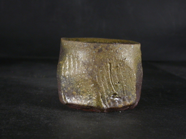 昭和19年備前市生まれ。趣味で備前焼を始め現在の備前焼に飽きたらず窯を築いて作陶生活にはいる。以来20年現在では山の中で野鳥の写真を写しながら作陶三昧の生活を送っています。ゆっくりろくろを回し手捻り風の作品や独特の雰囲気の面取の作品を作り、人工的な手法を嫌い割り木のみで炊き上げ独特の色合いの作品を作ります。このぐい呑は今回窯出しの最新作で面取・鎬を入れた雰囲気のある作りに、焼けは良く焼き締まった地肌に黄・焦げ茶のゴマがたっぷりと掛かり良い雰囲気の作品となっています。高さ約5.3センチ、径約7センチ。栞付き。
