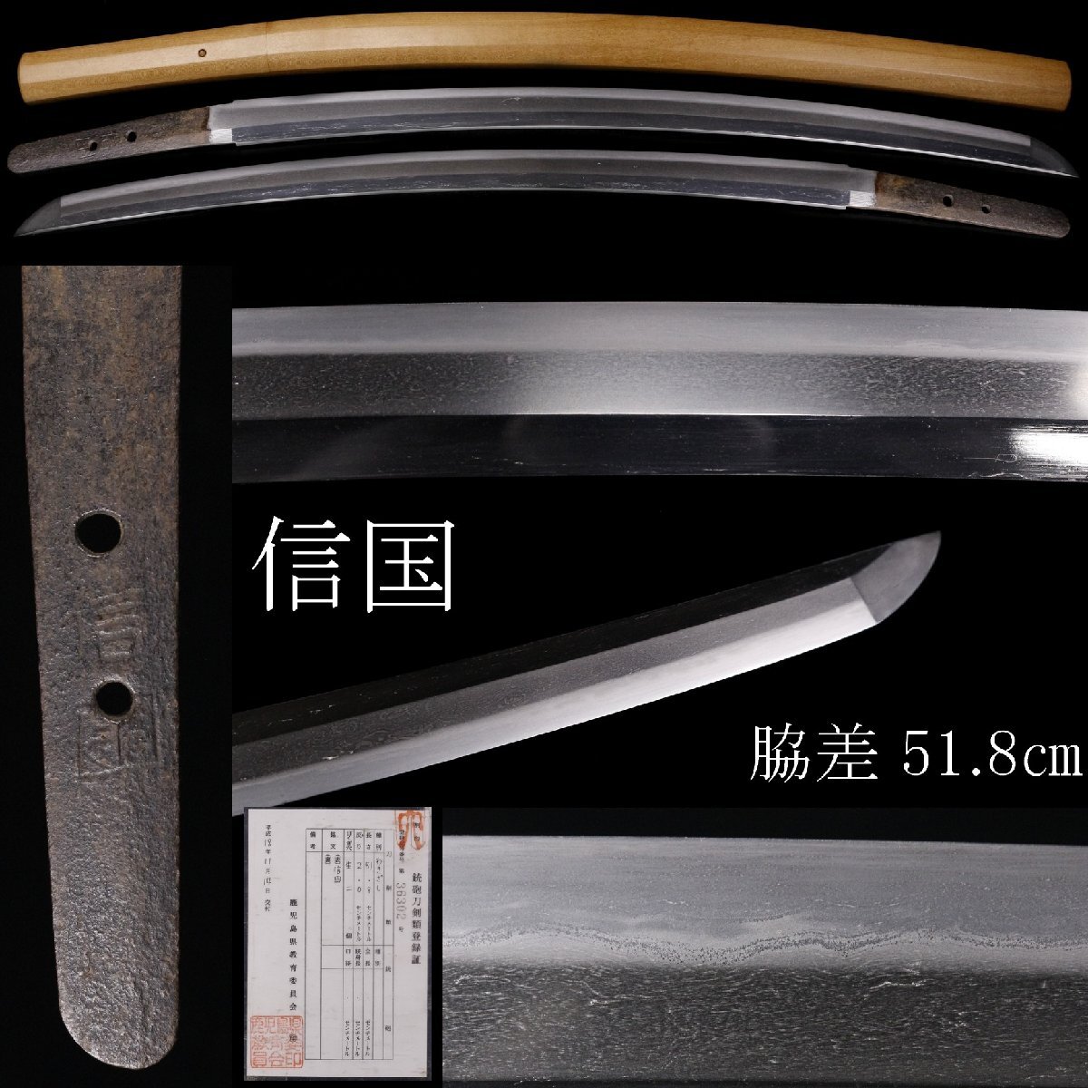 [.RQ]25.10 251017F09| * * * 商品詳細 * * * ここでしか出逢うことのできない唯一の美をご紹介させて頂きます。 反り深く凛々しい、迫力ある姿をした脇差です。 実寸よりも大きく感じさせる覇気があり、明るく鈍い輝きに見惚れます。 働き入り、その複雑な表情にも目を奪われる、 日本刀ならではの芸術的な美が味わえる逸品です。 この機会に是非お手元にてご堪能下さい。 ■商品内容/脇差本体、白鞘、登録証。 ■本身サイズ 全長/65.5㎝ 刃渡/51.8㎝ 元幅/2.7㎝ 先幅/2.1㎝ 元重/0.5㎝ 先重/0.4㎝ 本身重量/468g ■状態/キズ、サビ、切先に潰れ、ハバキ下に潰れ、 白鞘にスレ、キズ、シミ、へこみ、テープ跡がございます。 刃毀れ、ハギレはありません。     ※写真にてご確認、ご了承の上ご入札ください。 ご落札(購入)後は所定の期日までに都道府県の教育委員会に所有者変更の届出をお願い致します。  !かんたん決済  * * * 発送詳細 * * *  入金確認後3営業日以内に発送致します。 ※直接引き取りも可能です。 60~160サイズにつきましては 佐川急便、ゆうパックのどちらかで発送いたします。 ゆうパック発送の場合、弊社の発送日から追跡サービスに問合せ番号が反映されるまで 約1日ほどお時間がかかりますのでご了承下さい。 * * * 注意事項 * * * 運送中の破損があった場合は速やかに当社までご連絡下さい。  保険を利用するのに受取連絡後に運送会社による現場での破損状況確認が必要となります。  勝手に返送されますと保険の適用外となりますのでご注意ください。   * * * * * * お問い合わせ:082-236-8669 |