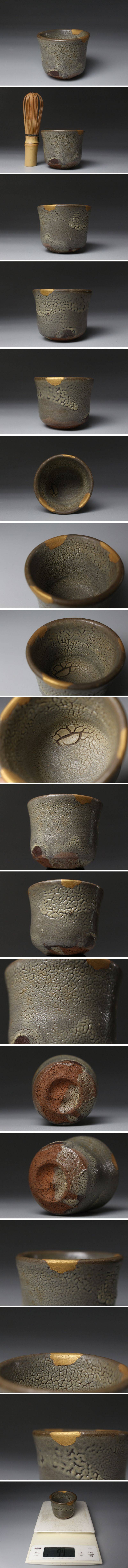 ②[.-WI]25.10 25102304T| * * * 商品詳細 * * * ここでしか出逢うことのできない唯一の美をご紹介させて頂きます。 しっとりとした灰黒色の釉調の中に、蛇の鱗を思わせるような独特の縮れ模様が現れるこの盃は、古唐津の中でも「蛇蝎釉」と呼ばれる特異な美を湛えています。 高温焼成によって生まれた釉の流れが器肌に命を吹き込み、時代の風格と侘びの趣を感じさせます。 口縁には金継ぎの補修が施され、長い歳月を経てなお愛され続けてきた器の物語を静かに語ります。 掌に収まる筒形のフォルムは、酒を注ぐたびにその重厚な存在感と温もりを伝え、使う人の心を穏やかに包みます。 この機会に是非お手元にてご堪能ください。 ■商品内容/ 筒盃 ■サイズ/横6.5㎝×高5.5㎝ 重量:97g ■状態/ スレ、小傷、汚れ、直しがございます。 ※写真にてご確認、ご了承の上ご入札下さい。