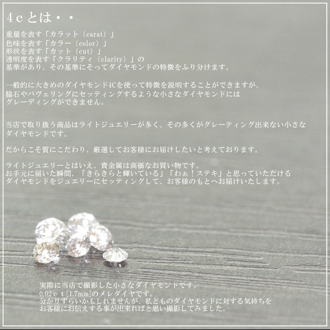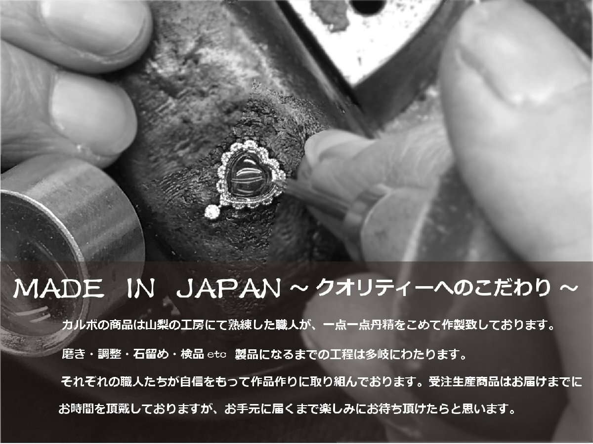 | その他 | 全国送料無料 ※なるべく実物の色あいに近づけるように心がけて撮影していますが、モニター環境によって素材感や色合いが若干異なる場合がございますのでご了承ください。 ※ジュエリーはとてもデリケートです。入浴やスポーツ、家事をするときはお外し頂く事をお勧めいたします。 また、汗や温泉、化粧品やフレグランスなどは変色や劣化の原因となりますので取り扱いにはご注意ください。 |