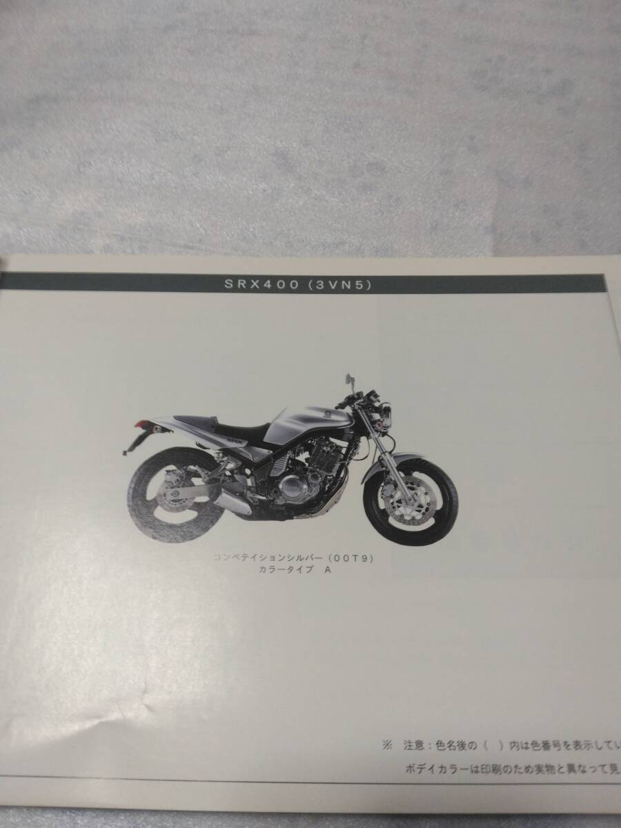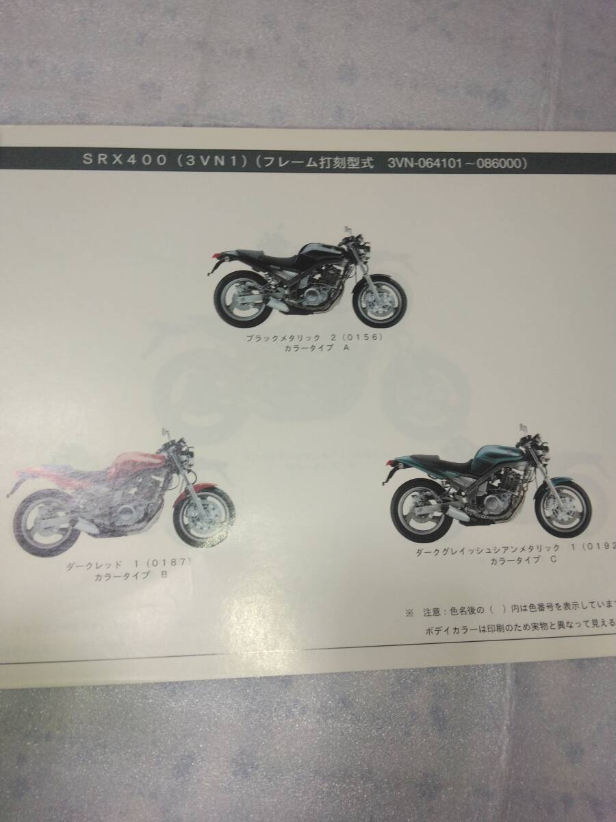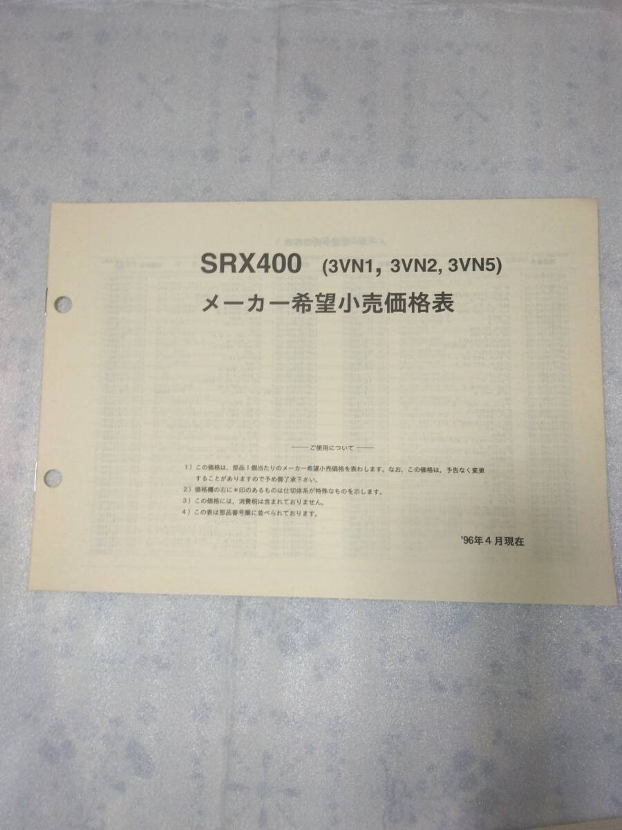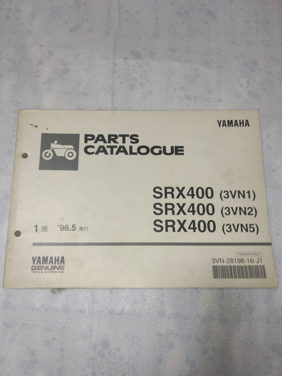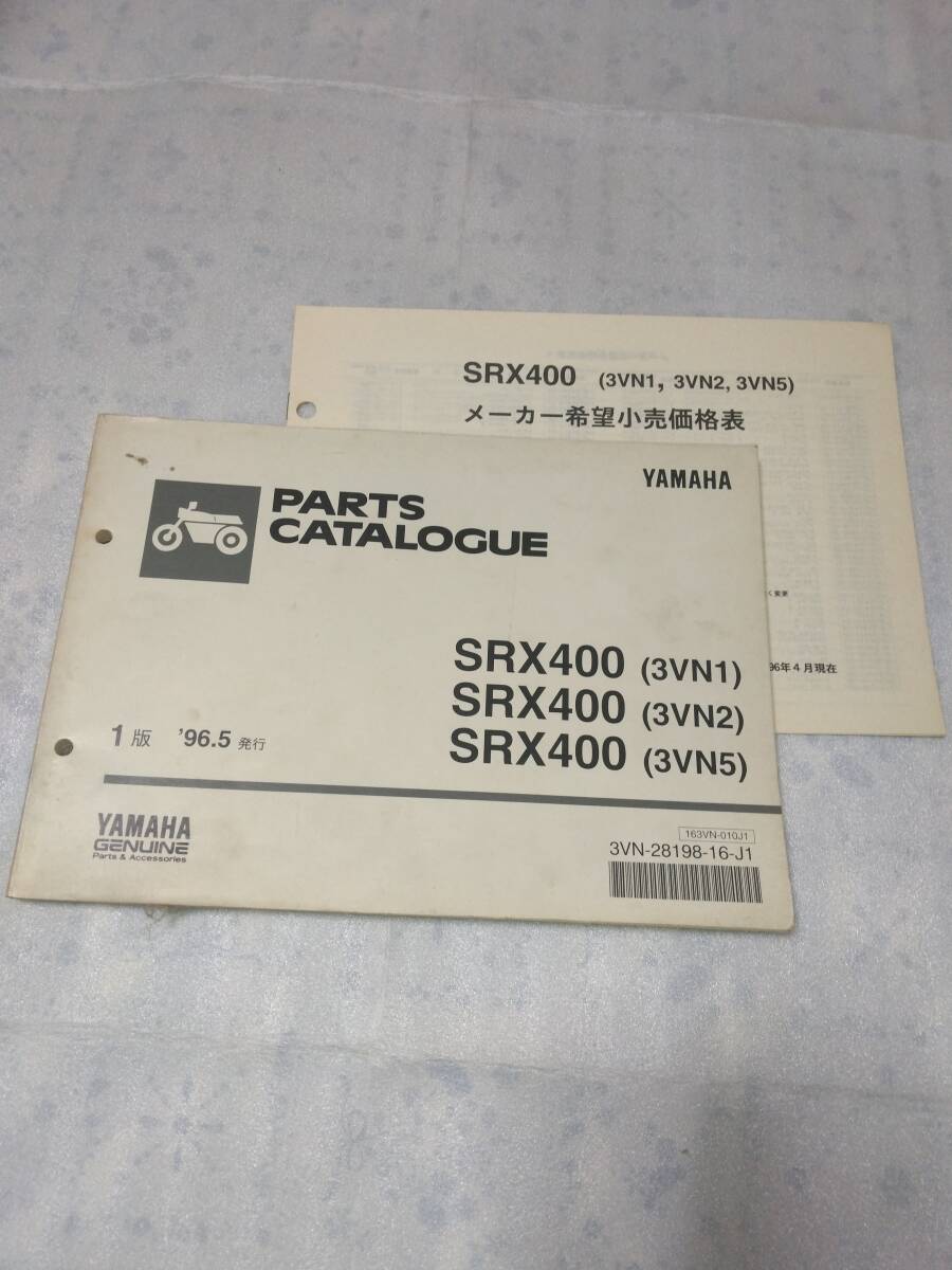 SRX400(3VN1/3VN2/3VN3) パーツカタログ 1版 ’96-5発行 メーカー希望小売価格表あり。表面は傷・汚れあり。中は 黄ばみありますが 汚れ少なく 状態は 綺麗な方だと思います。パラパラとめくって確認しただけなので 見落とし等あるかもしません。神経質な方は ご入札お控え下さいませ。中古品の為 基本的にはノークレーム 返品なしでお願いします。