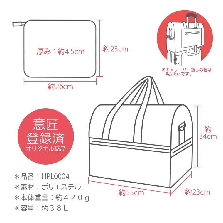 使わない時はコンパクトに折りたたみ可能。スーツケースに載せてもズレ落ちない『キャリーオン機能付』なので、旅行時のお土産入れやサブバッグに便利です。