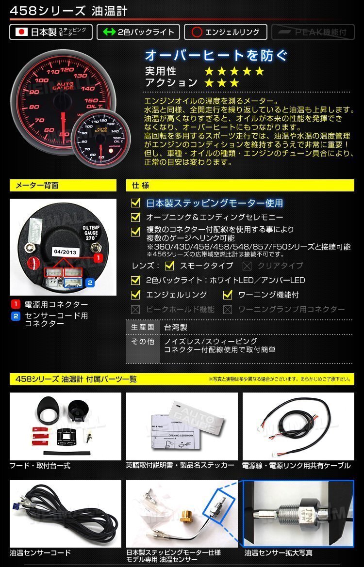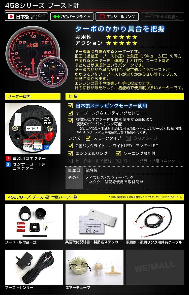 日本製ステッピングモーター搭載 オートゲージ プレミアム 458シリーズ 水温計/油温計/ブースト計 52mm 3点セット 点灯色: ホワイト / アンバー ワーニング機能付 エンジェルリング機能付(文字盤周囲が赤く円状に発光) |