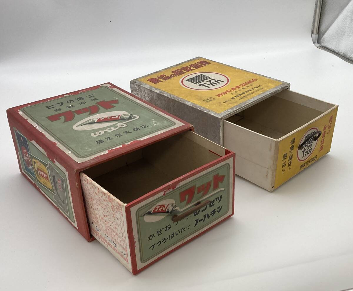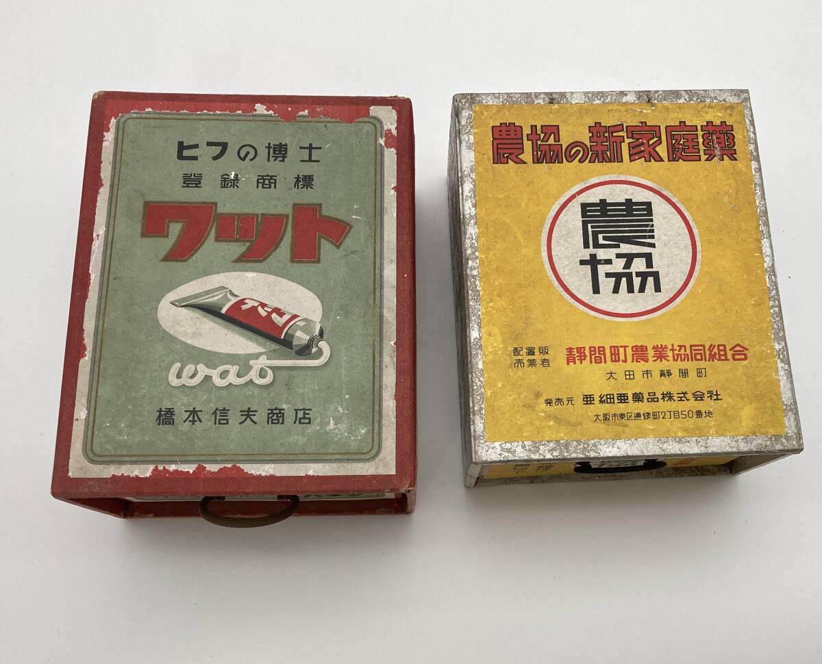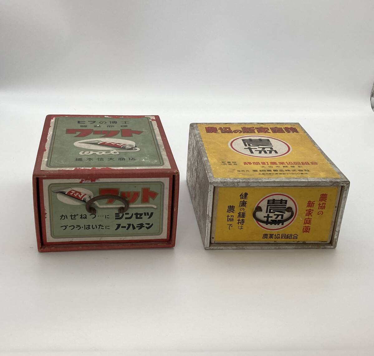 | 昭和レトロ 戦前戦後 古い配置薬箱、置き薬箱 2点 / ワット・橋本信夫商店、 農協の新家庭薬 | |