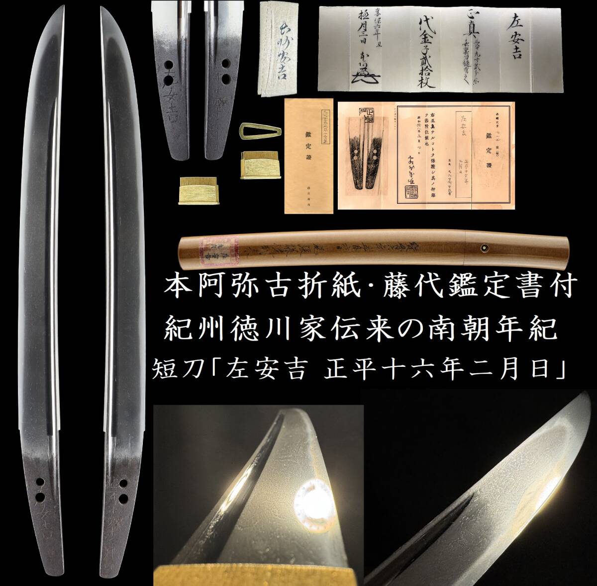 本阿弥光忠の折紙と藤代義男の鑑定書が付属した、尾張徳川家から紀州徳川家へと伝来した華麗な来歴を誇る、左安吉の裏年期入りの傑作短刀です。