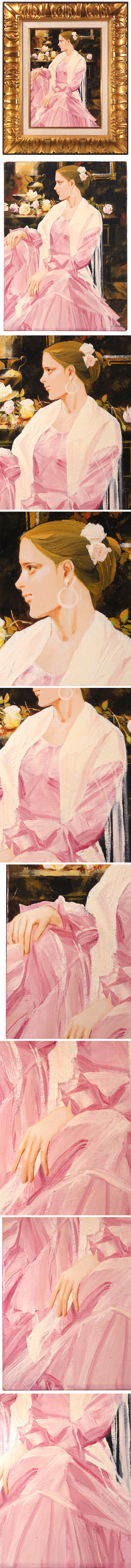 スペイン南部の都市セビリアの女性をモチーフとした美人画で、ピンクのドレスに身を包む美しい女性が斉藤三郎らしい力強く素早いタッチと鮮烈な色彩構成で描かれ、背景の飾り棚には薔薇が散らされ、いかにも高貴で華やかな雰囲気を伝えています。