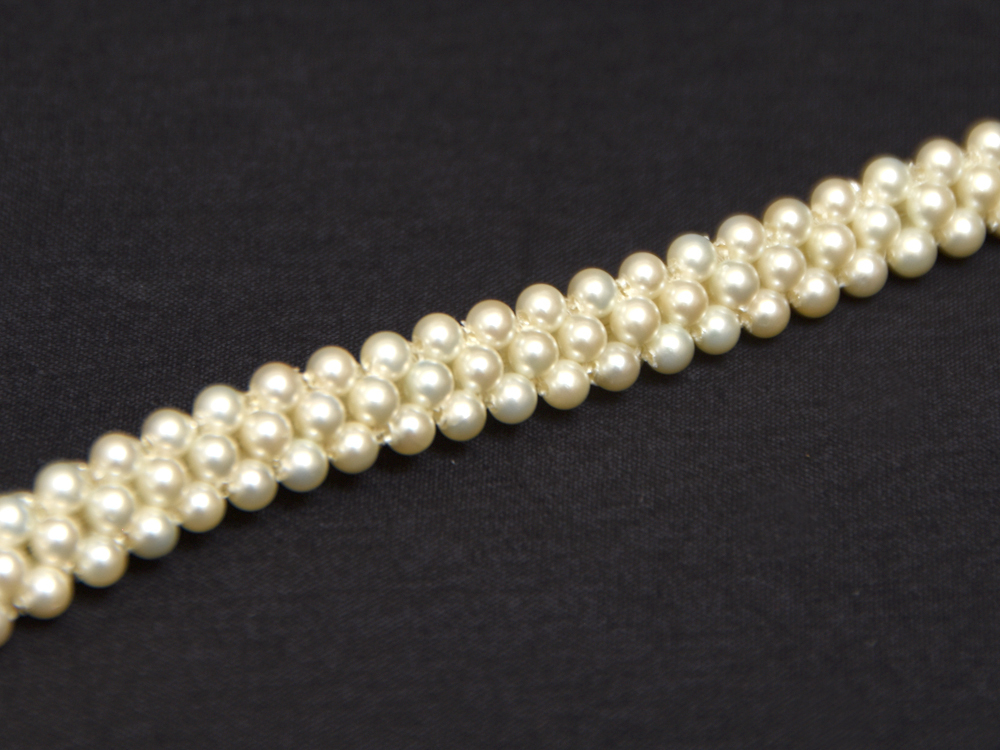 総パールの帯締めです。 約3㎜の小さなパールを結び結わせてつくられております。 ドーナツ型の宝飾パーツがついており、落ち着きのある煌びやかでしなやかな品物です。 側面からみると分かりますが、帯締めとして利用しやすいよう三角形のような形状をしております。 万代宝飾と記載のあるしおりも付属しております。 丁寧に保管管理されており汚損破損はなく状態は良好です。 ※撮影の際に生じた写り込みなどがございます。 ご理解の程よろしくお願い致します。 |