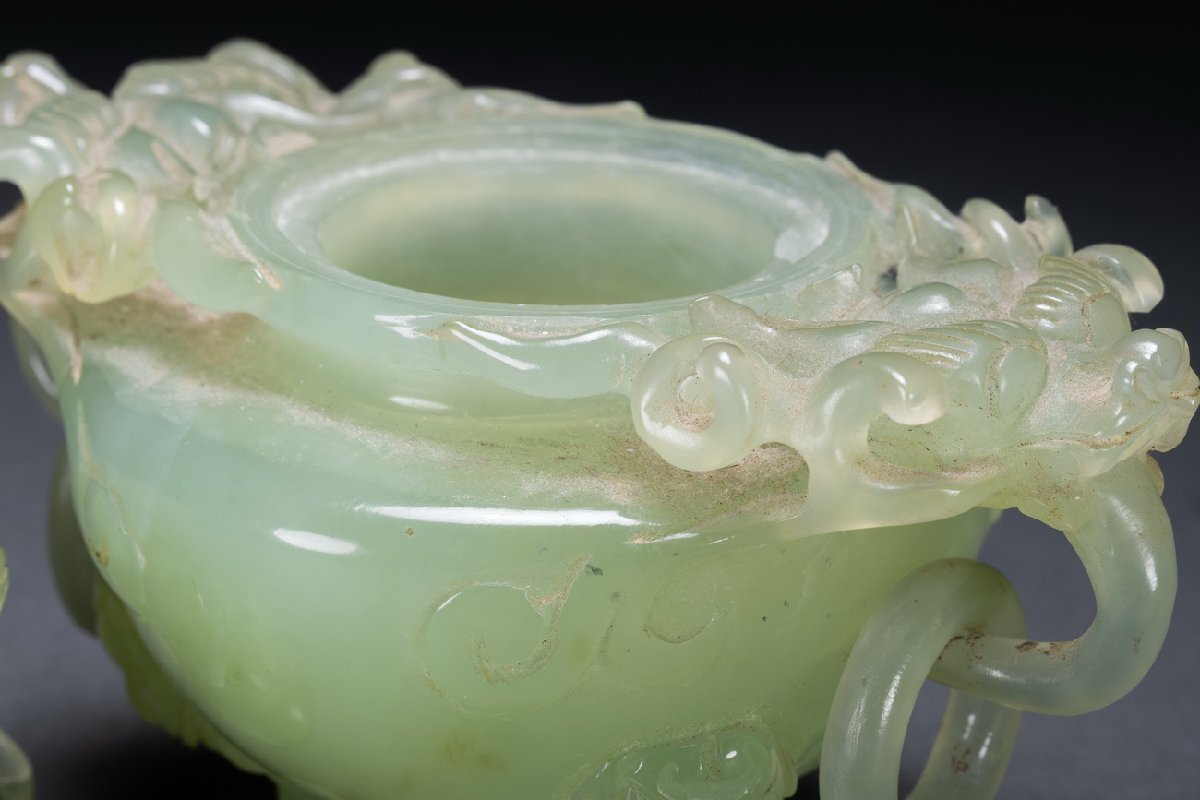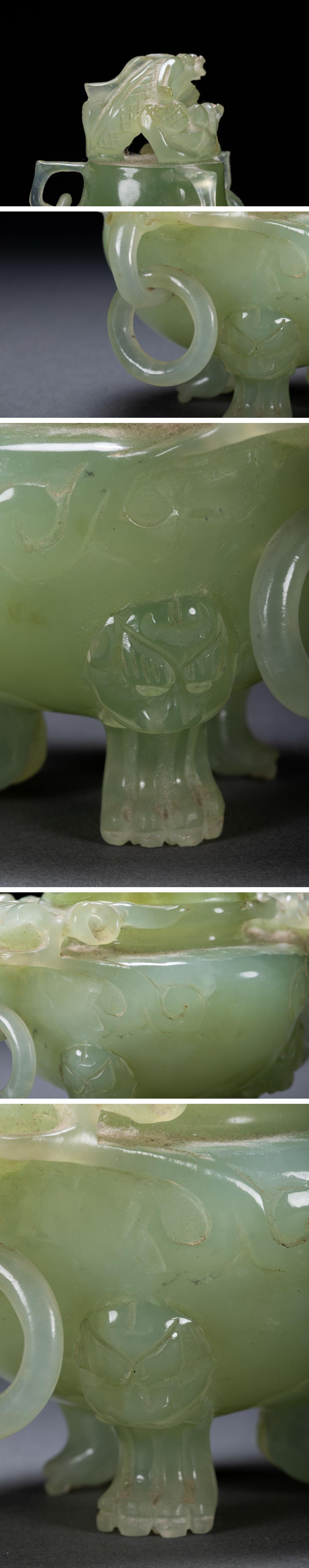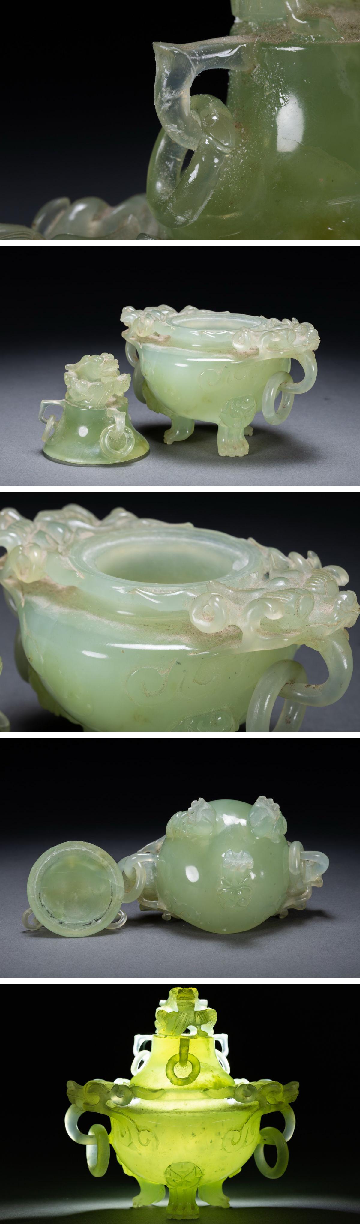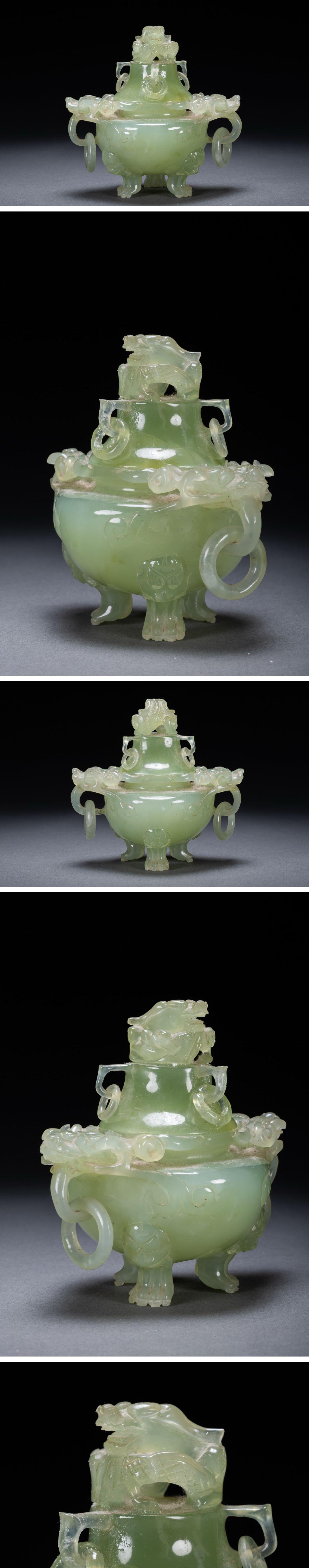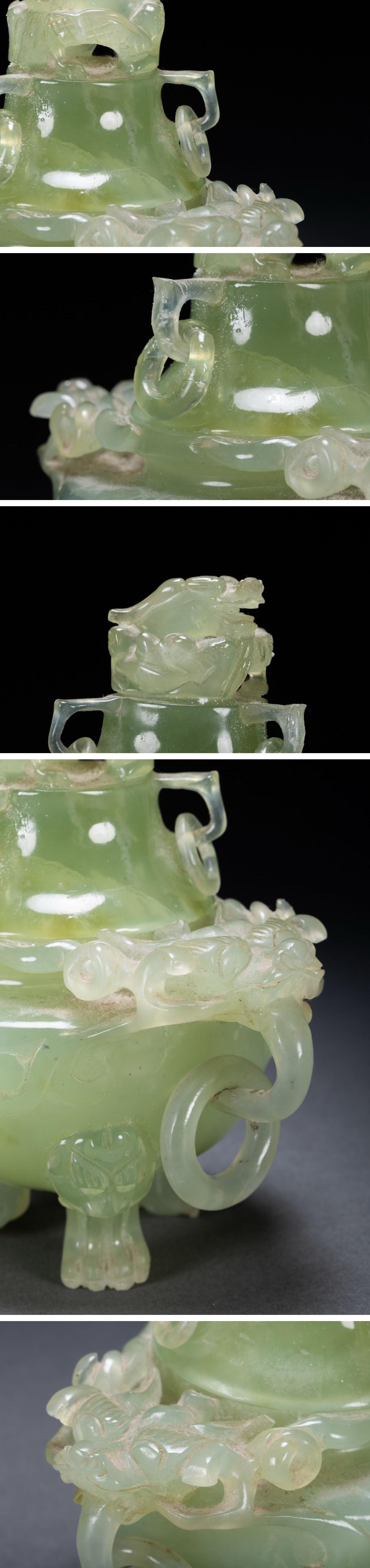 【雲錦】某有名オークション購入 時代物 天然碧玉 三足双龍耳香爐 修復あり 古置物 古擺件 古美術 時代コレクション7L10-62S07