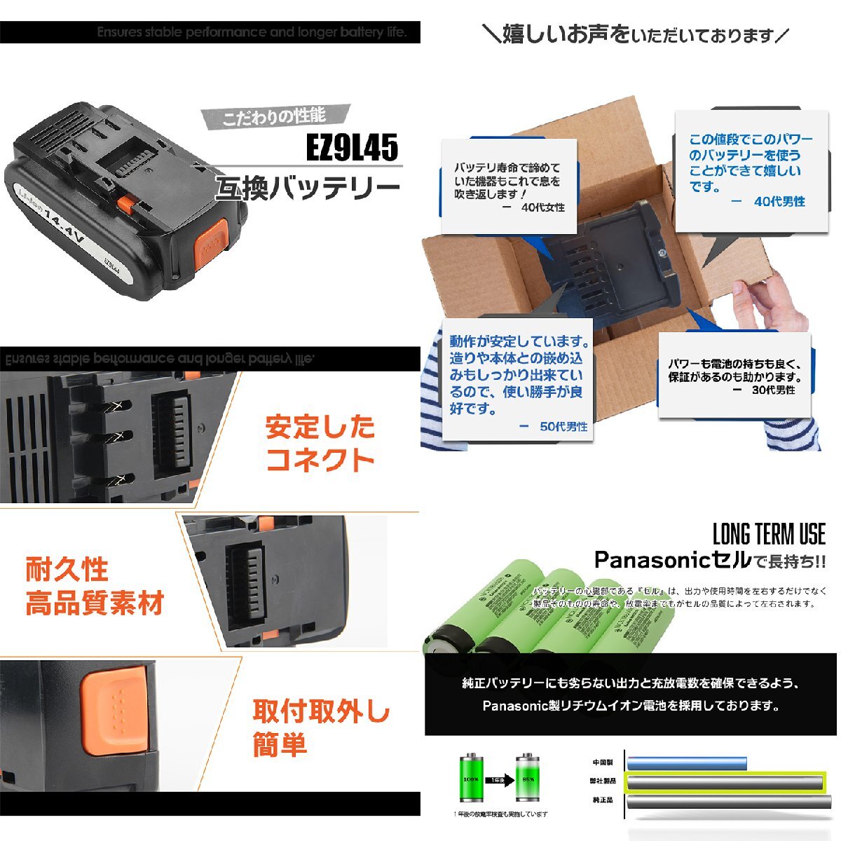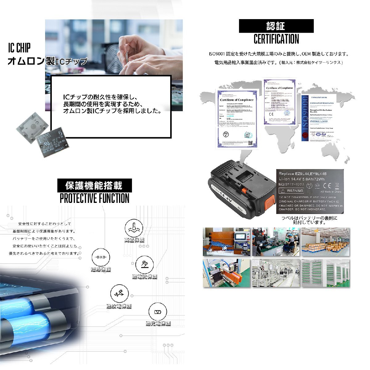 型番:EZ9L45 EZ9L44 EZ9L42 EZ9L41 EZ9L40 種類:リチウムイオン 認証:PSE・CEマーク取得済 容量:5000mAh (5.0Ah) 電圧:14.4V 機能:保護回路・過電流保護・過充電防止・過放電防止 |