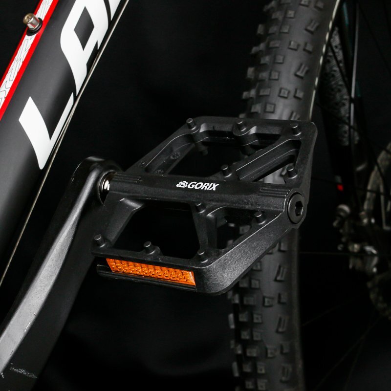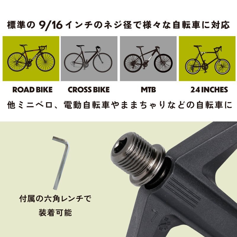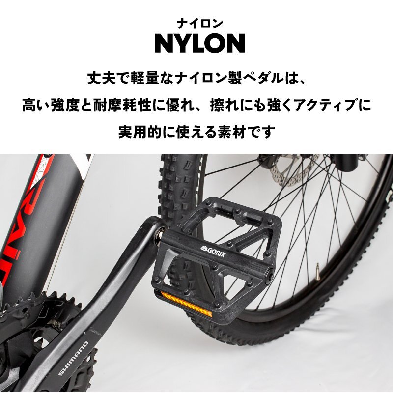 夜間やトンネルなどで視認性が高まるリフレクター付き。 自転車通勤や自転車通学などに使える実用的なペダルです。 ナイロン製のボディは高い強度を持ちながらも軽量で、耐摩耗性も抜群です。 靴との擦れにも強く、長くご使用いただけます。 さらに、ワイドな踏み面が特徴的で、しっかりと踏み込むことができます。 漕ぎ出しや力の逃げを防ぐため、効率的なペダリングが可能です。 このフラットペダルは、自転車を使った様々なシーンで活躍します。 街乗りやサイクリング、通勤や通学など、幅広い利用シーンに対応しています。 商品内容フラットペダル サイズ本体長さ105.3x幅100mm,、厚み18mm(ピン含まれず)~22mm(ピン含み) 重量約265g 材質高強度ナイロン本体、クロモリ鋼軸 軸長63mm ベアリングDU+ベアリング シャフト仕様シャフトセンター厚み最大12mm、シャフト耐圧性平均値65kgf 片側10ピンピン高さ約4.6mm 軸径標準9/16インチ(ネジ径 約14.3mm ) |