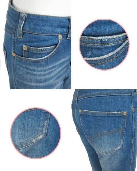 | シンプルデザインのデニムパンツ。はんぱ丈なので春夏スタイルで活躍してくれます。ややゆとりのあるデザインで、カジュアルスタイルで活躍してくれます。ポケット口や裾などにユーズド加工がありオシャレです。 |