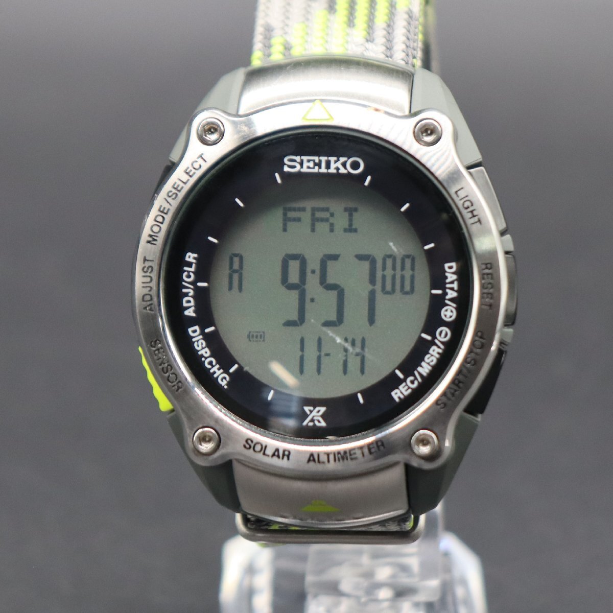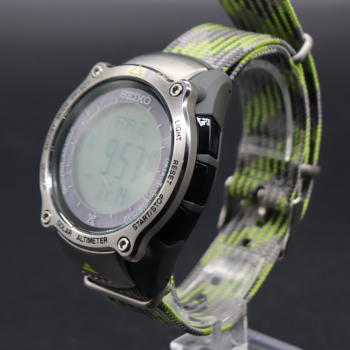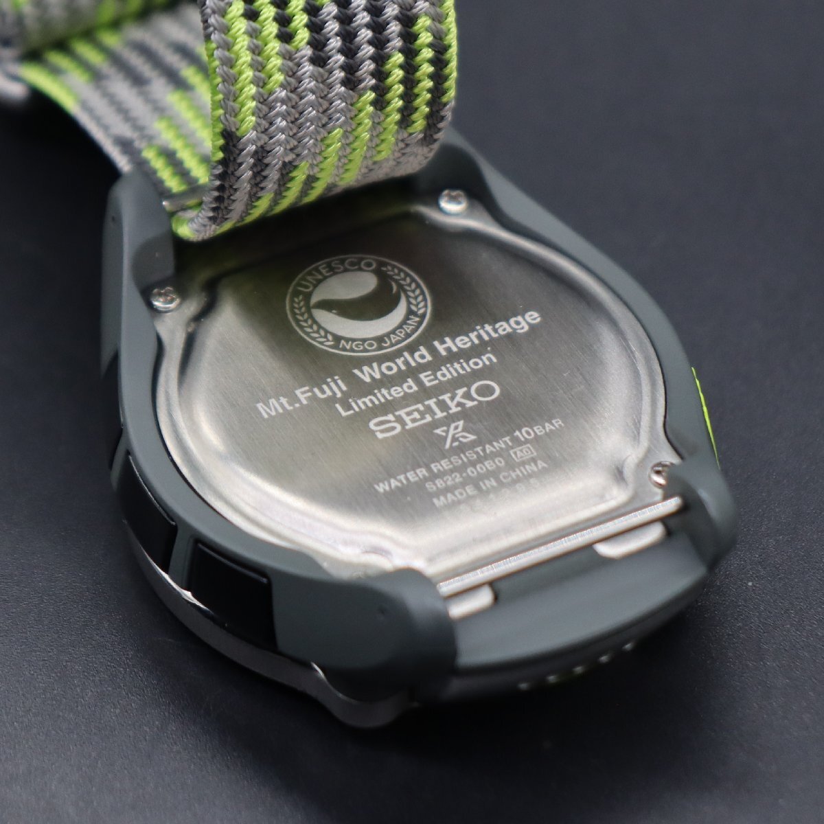 平置きで24時間動作確認済み、遅れなく稼働中です。 充電池残量は不明です。 現在時刻に調整済です。 左上ボタンでモード切替、 アラーム/ストップウォッチ/ライト点灯機能、動作確認済みです。 ※詳しい操作方法は「SEIKO 取説」→「S822」にてWEB検索頂き、 公式サイトの取扱説明書にてご確認ください。 ベゼルに使用に伴う小キズや小汚れ、ガラスに線キズございますが、 ケースは目立った傷みなく、文字盤は液晶画面は目視で傷みなく、 視認性は保たれており、良い状態です。 ボタン操作、良好です。 裏蓋には世界遺産活動への協力の証である、日本ユネスコ協会連盟のロゴマークと 「Mt.Fuji World Heritage Limited Edition」が刻印がございます。 ベルトは使用感少なく、全体にきれいな状態です。 状態について、詳しくは画像にてご判断願います。 | |