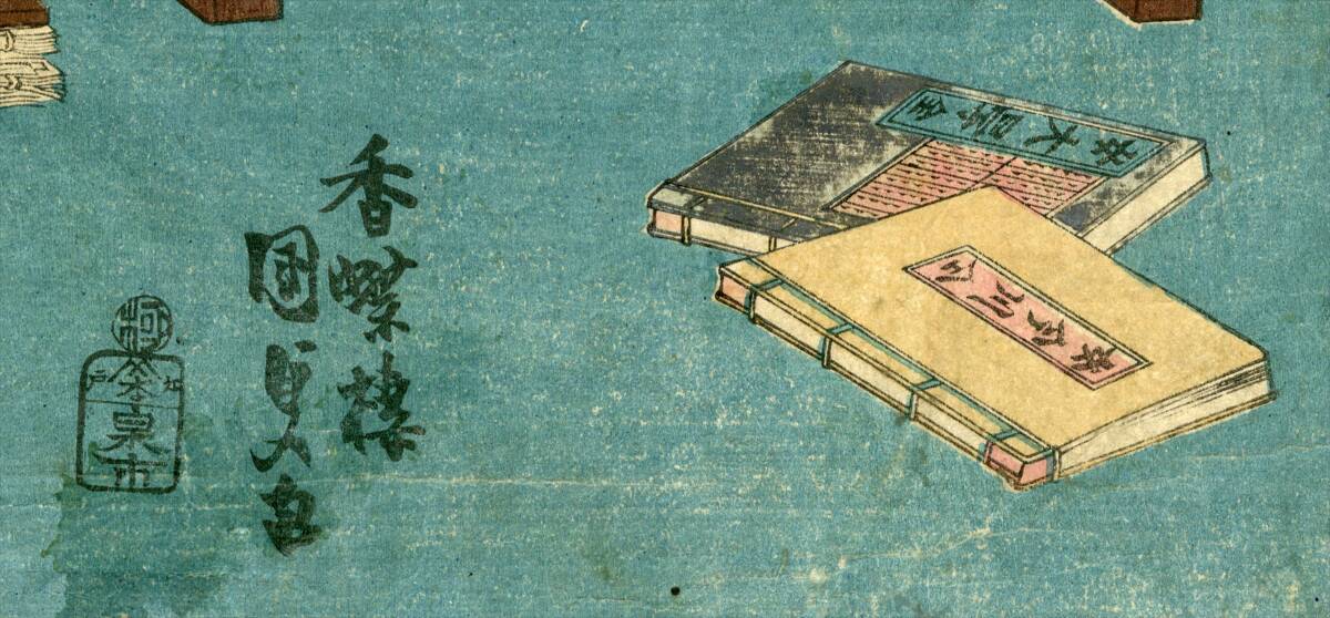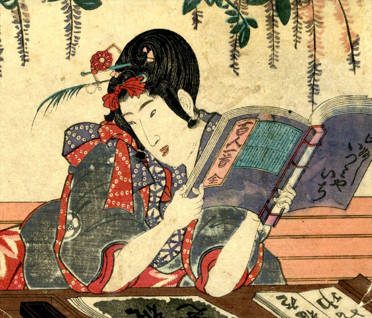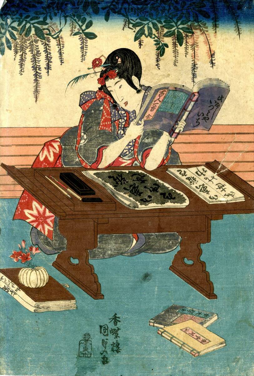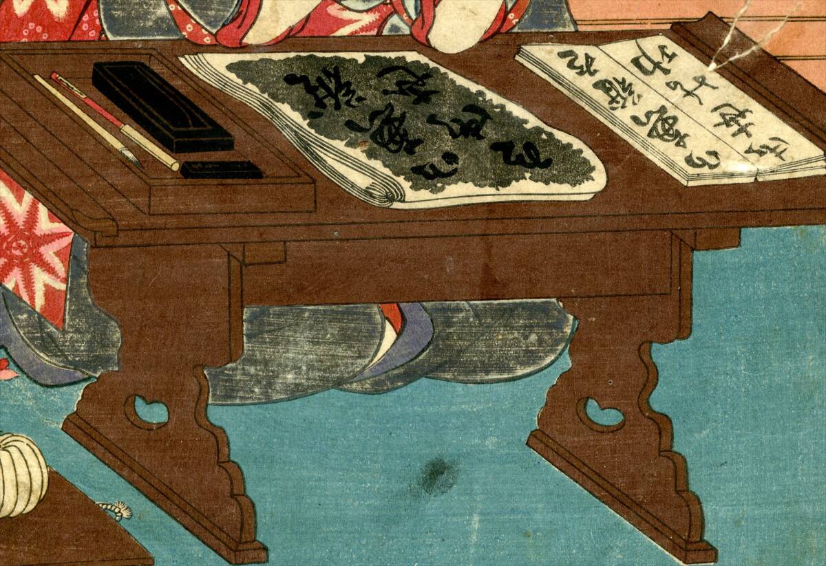 | 国貞 真作 「栄草当世娘/大判錦絵三枚揃のうちの中央一枚」 浮世絵 江戸 木版画 天神机 |