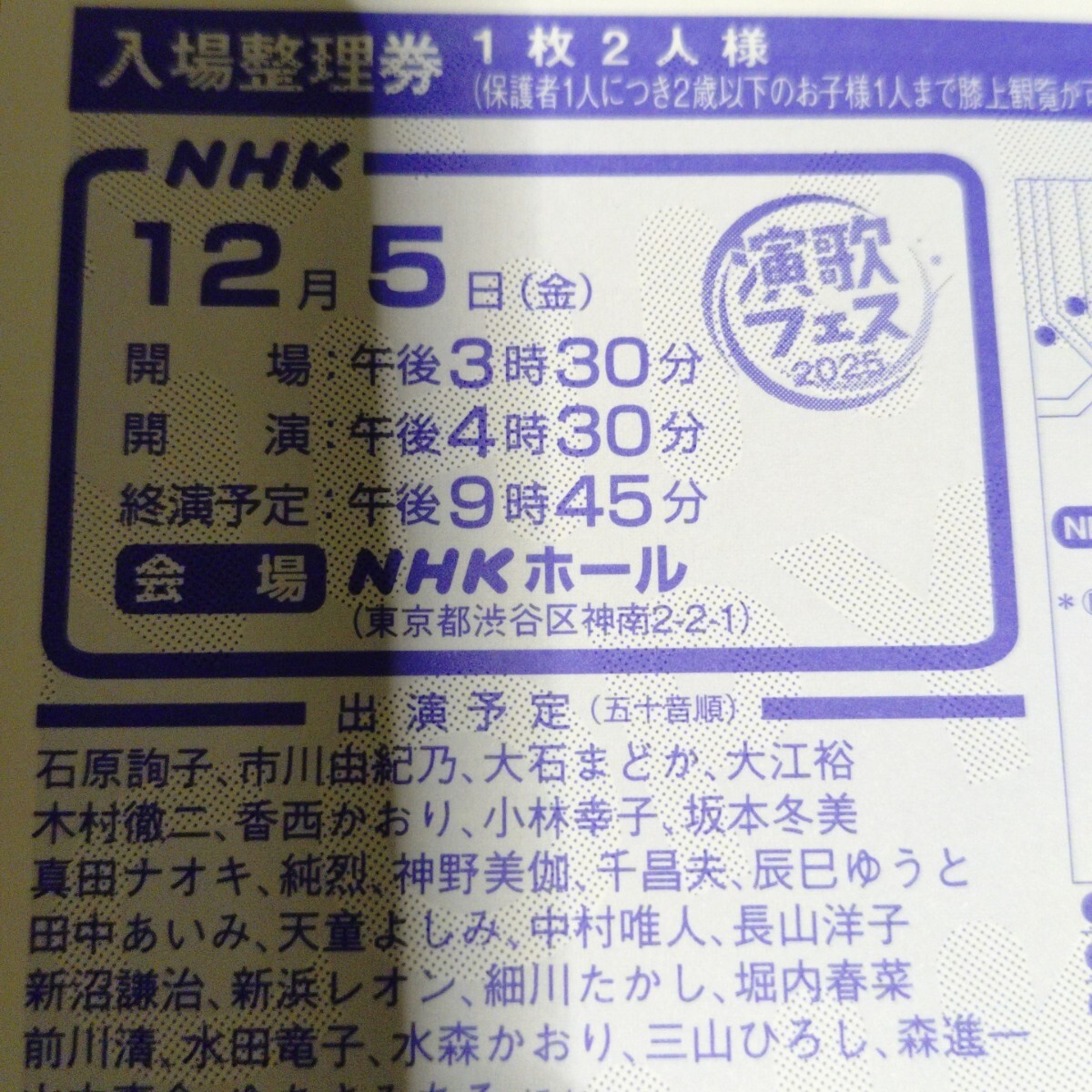 □商品説明☆『商品名【演歌フェス2025】「12月5日(金)(NHKホール)〈入場整理券〉」葉書(2人様分)】★』①【開催日】12月5日(金)②【開場】午後3時30分③【開演】午後4時30分④【終演】午後9時45分⑤【会場】「NHKホール」(東京都渋谷区神南ニ丁目2番1号)⑥【座席指定席】「2階席L15列」(14番〜25番の間【出場予定歌手】「NHKのHPで確認してください」□【注意事項】「落札後は『NC、NR』で宜しくお願い致します。◇『商品説明に何かご不明な点が御座いましたら何なりとご質問下さいませ!』■「落札後は、早期にご連絡を頂ける方で〈評価の悪い方、新規の方〉のご入札は、ご遠慮をお願い致します。ご入札された場合は、こちらのご判断でご入札を削除させて頂きますので予めご了承とご承知置き下さい。」★『商品説明に納得とご理解された方で〈演歌歌手のファンの方〉この機会にご検討の程を宜しくお願い致します。』以上。