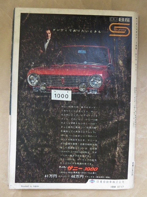 | ★商品説明★ | 自動車雑誌の長期保管品を出品致します。 現状お渡しとなります。 商品名 【長期保管品】 雑誌 #41 モーターマガジン/Motor Magazine 刊行/1966-7月号/JULY モーターマガジン社 商品詳細 全280ページ モーターマガジン社 動作確認 各頁の欠損や落丁の細かな確認はできておりません、ご了承ください。 付属品 冊子のみとなります。 ※商品画像の撮影品が全てになります。 状態 ・個人宅回収品の古紙扱古雑誌です。 ・記名として〝名字印〟が捺されているページが含まれます。 ・オレマガリ、スレ、シミ等見られます。 ※ただし、個人の感性になりますので、自己責任でご入札ください。 サイズ・重量 B5判 重量 / 430g ※多少の誤差がある場合があります、ご了承ください。 | |