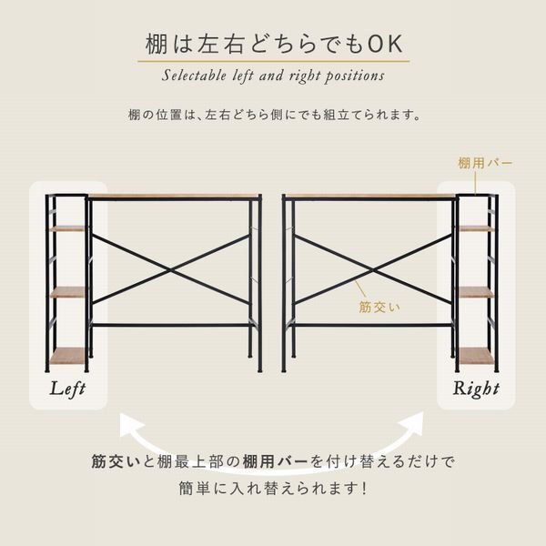 | 立ちながら作業ができるスタンディングデスク! スタンディングデスクは姿勢改善、カロリー消費、血行促進、腰痛予防など、総合的な健康改善に役立ちます。 フットレストつきなので、脚の負担を軽減します。 棚の位置の入れ替え可能で、棚の位置を自分の好みで左右に入れ替えることができます。 |