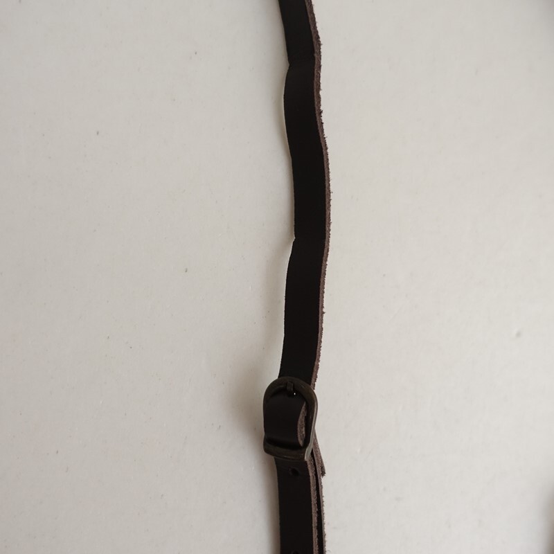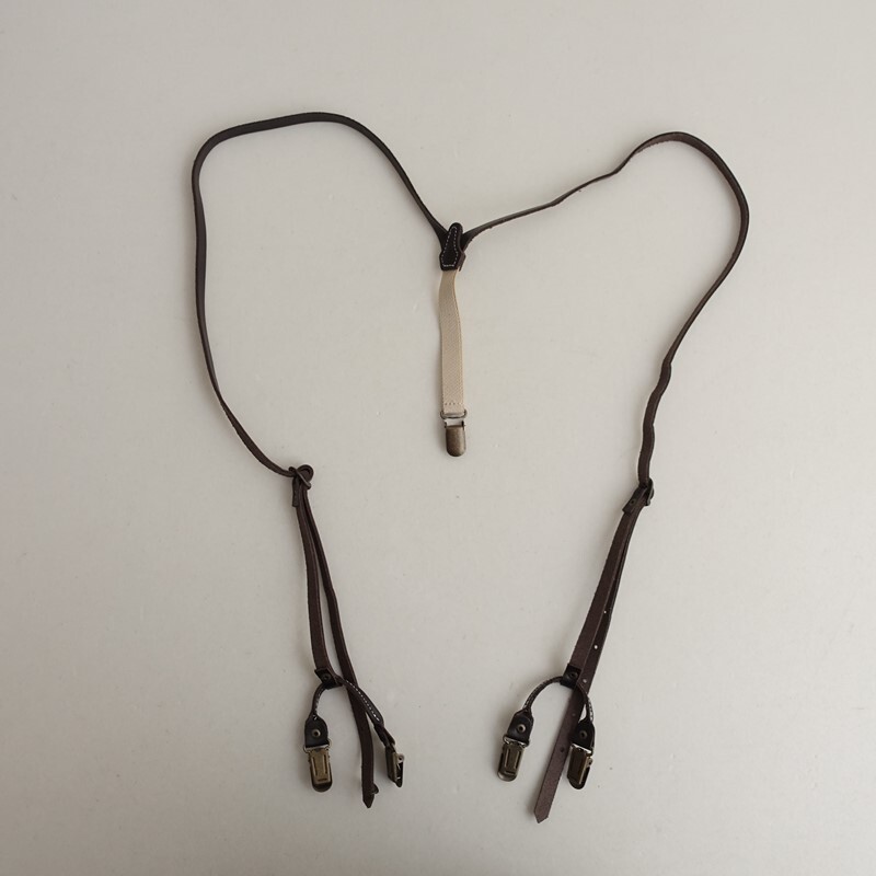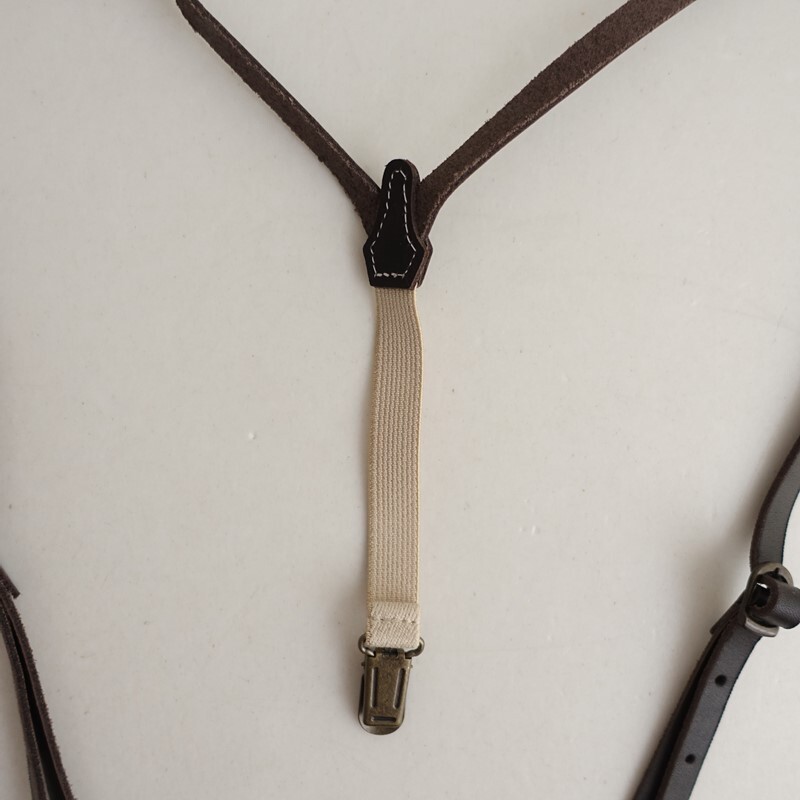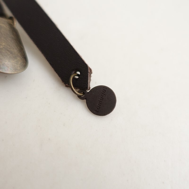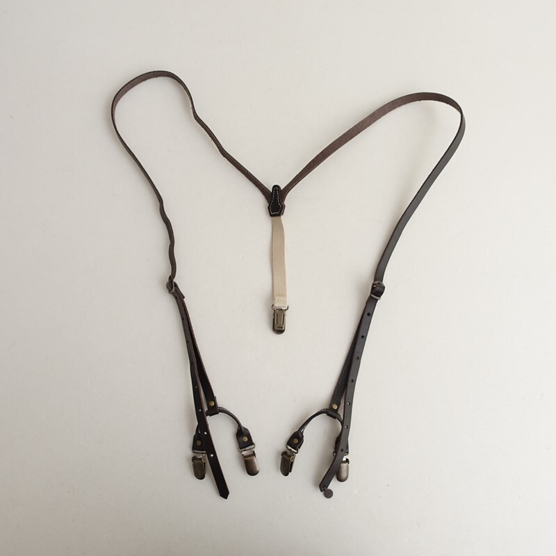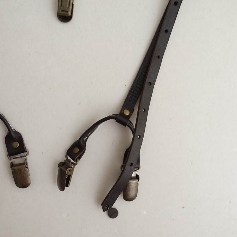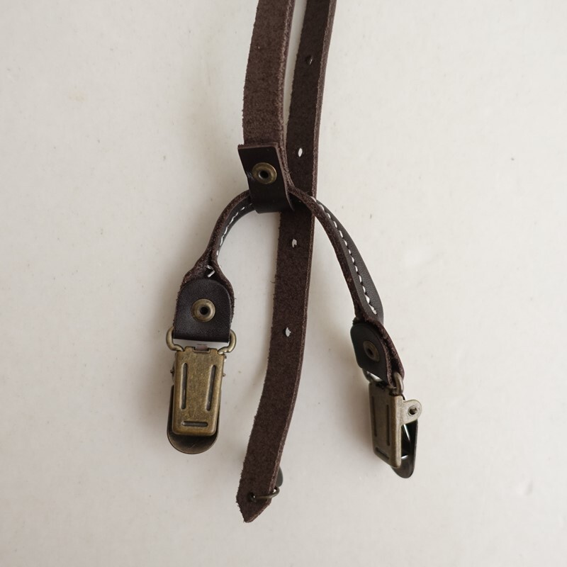 | tumuguのレザーサスペンダーです。カラーは、ダークブラウンです。ナチュラルな風合いが洋服を引き立ててくれるサスペンダーです。ふつうに使っても、おろしてコーディネートのアクセントに使っても。 |