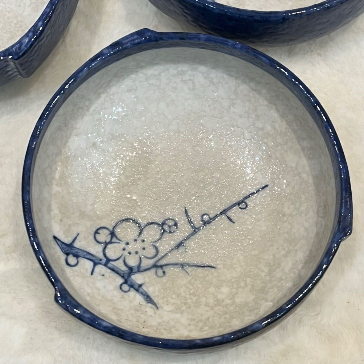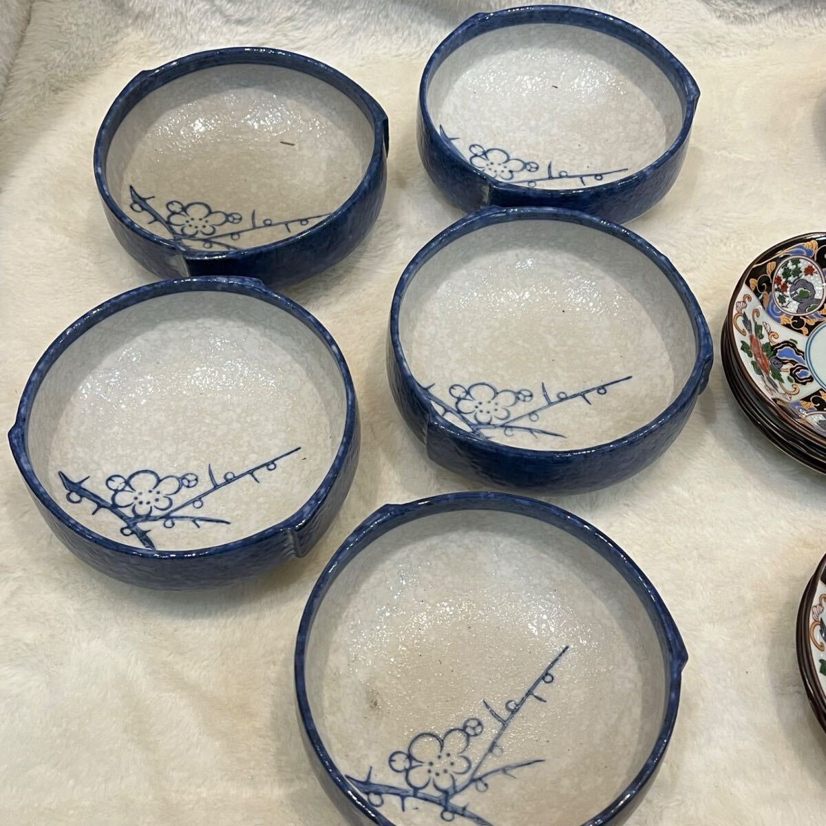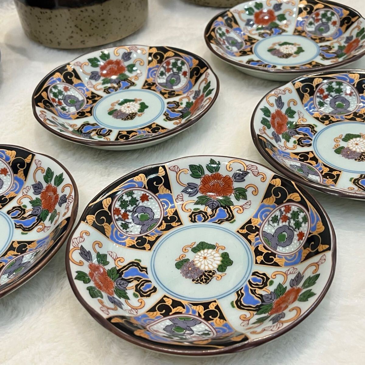 これは日本の伝統陶磁器で仕上げられた小皿・小鉢セットで、特徴的な3種のデザインがまとまっています。白地に青絵の梅の枝が描かれ粒状の釉薬肌が渋い風合いを出す青華梅柄小鉢、黄土色の素朴な陶土地に立体的な柿と葉の模様で温かみを感じさせる民芸調の柿柄小鉢、さらに黒地に金彩や赤・青などの彩色で菊や牡丹を描いた九谷焼風の華やかな錦絵柄小皿が含まれ、主に和食のお漬物やおせち料理、お茶菓子を盛る器として使われるほか、「食器が食事の楽しさを増す」和の美学を体現した装飾的なアイテムとしても人気があります。| 出价者 | 信用 | 价格 | 时间 |