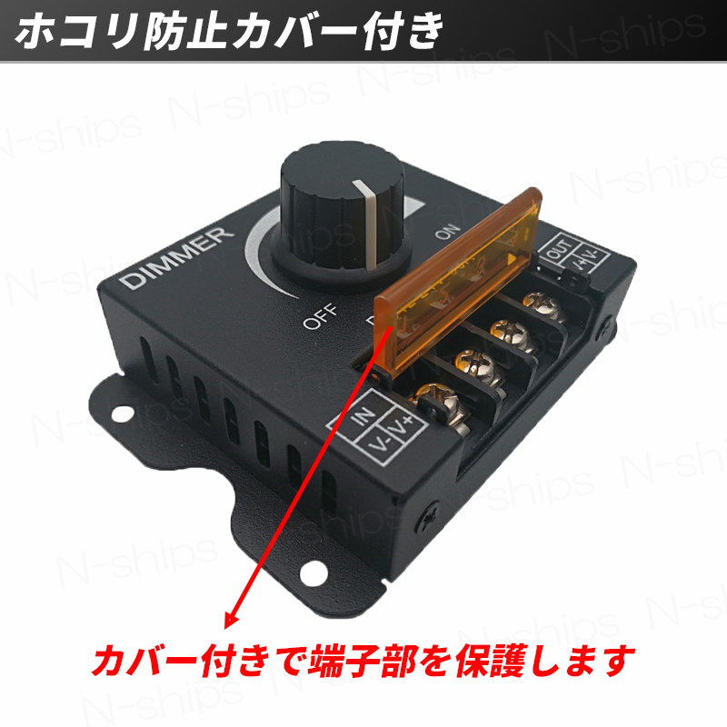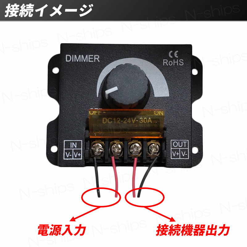 | 【商品説明】 LEDライトやLEDテープなどの各種照明、 さらにはグリルマーカーや集魚灯など、 DC電源を利用した機器の調光器です。 入力電圧は12V/24Vで、 幅広い用途で利用が可能です。 小型で狭い場所でも設置が可能で、 接続も配線をネジで締めるだけ! 0%~100%での無段階調整が可能! 状況に合わせてつまみで簡単に自由な明るさに調整できます。 ■商品仕様■ 調整可能範囲:0%~100% 入力電圧:12V/24V 最大負荷電流:30A 動作温度:-20~60℃ サイズ:85mm×66mm×35mm 重量:約96g ※防水ではありません | |||