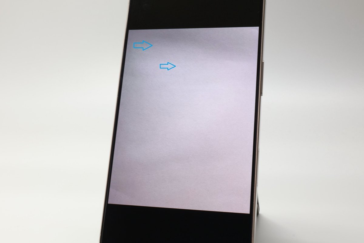 ・インカメラ撮影時、写真ともに横(青矢印)に光のラインが写り込みます(写真6 ※インカメラで撮影した写真を撮影してます)