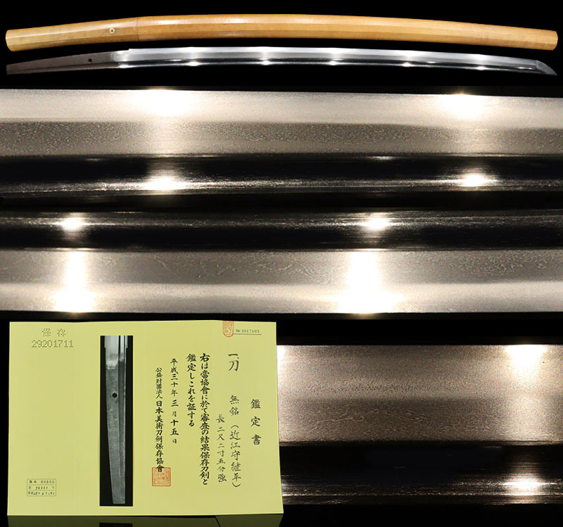 | ■刀剣のサイズ表示について 元幅・・・焼出し付近を測定しております 先幅・・・横手筋付近を測定しております 元重ね・・・焼出し付近の厚みを測定しております 先重ね・・・横手付近の厚みを測定しております (多少の誤差はご容赦ねがいます) ■銃砲類のサイズ表示について 全長・・・銃身先から台木尻までを測定しております 銃身・・・台木を除いて金属部分を測定しております (多少の誤差はご容赦ねがいます) 当社が出品する刀剣類は、入手した時の状態のまま出品しております。 ハバキ、小道具等も当社で調整したり付け替えたりはしておりませんので、合わせではないかというクレームは一切受け付けません。 刀身の疵も隠すことなく載せておりますので写真をよくご覧になってご入札ください。 疵に関して、説明がない等のクレームは一切受け付けません。 写真ではわかりにくい部分は質問欄やお電話でお問い合わせください。 但し、説明欄に表記のない刃切れに関してのみ返品やご相談に応じます。 ※ご落札しご購入されお手元に届いてから20日以内に 登録証に記載されている各都道府県の教育委員会にご連絡し 登録証の所有者変更を必ず行ってください | |||