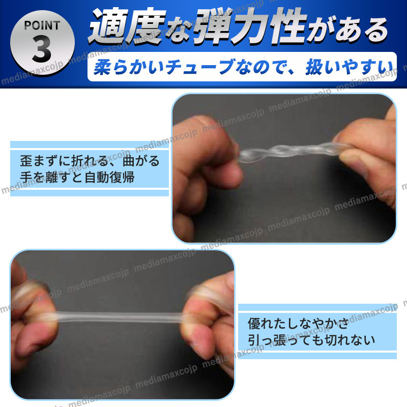 ![]() 半透明であるため内部の流体が一部見える特徴があります 長さは業務用でも使用できる100メートルあり、 内径は4ミリメートル、外形は6ミリメートルです 高品質なシリコン資材で作られております 【柔軟性】 シリコン素材は柔軟性に優れており、曲げたり伸ばしたりすることが容易です これによりエアーチューブを狭いスペースに配置したり、 複雑な形状に適応させたりすることができます 【耐久性】 シリコンは耐久性が高く長期間の使用や多様な環境条件に耐えることができます これによりエアーチューブは長寿命で信頼性の高い運用が可能です 【耐熱性】 シリコンは高い耐熱性を持ち広範囲の温度に対応できます エアーチューブが熱い流体や環境下で使用される場合でも、 シリコンの特性によって安定したパフォーマンスが維持されます 【高い透明度】 エアーチューブが半透明であるため、内部の流体の状態や流量を 視覚的に確認することができます これは、監視や制御が必要なアプリケーションにおいて便利です 【化学的安定性】 シリコンは一般的に化学的に安定しており多くの化学物質や薬品に対して 耐性を持っています。このためさまざまな流体や環境との接触において、 エアーチューブは変質や劣化を最小限に抑えることができます ![]() powered by auction-labo.com ●商品仕様 長さ:100m 素材:シリコン 内径4mm 外形6mm カラー:半透明 重量:約1300g/巻 | ||