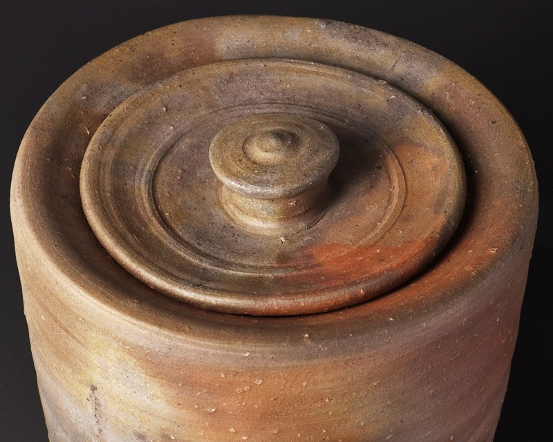 【金重道明】 1957年より朝日陶芸展、日展、日本伝統工芸展、一水展など各展に製作を発表、入選を重ね69年に日本工芸会正会員に就任。また、金重一門展以外にも精力的に岡山、東京、大阪を中心に個展を開催。主な受賞歴に70年金重陶陽賞、80年の日本陶磁協会賞があり90年は岡山県指定重要無形文化財の認定を受けている。父の薫陶や独自の研鑽により古備前に対する深い造詣を持ち、茶陶を展開、また面取、透かしの技法にて個性を出している。 |