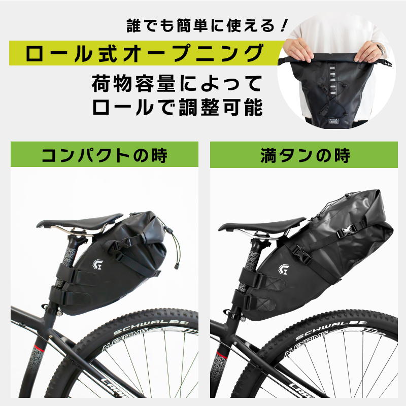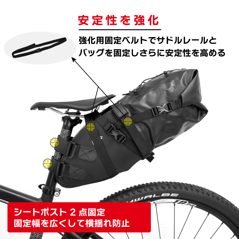 自転車 全般 ロードバイク マウンテンバイク クロスバイク ミニベロにサドル下に余裕があればどれでも簡単に取り付け可能です。 4か所固定で安定性アップ。 たっぷり大容量最大13L!工具や着替えやタオル等のかさばるアイテムも収納可能です。 量の多い荷物でも型崩れを防ぐ中敷き板を大きく箱状に配置。 型崩れを抑えて、中が広く荷物が収納しやすくなりました。 突然のゲリラ豪雨や天候が激変しても安心の防水性。 荷物を背負う事無く車体に収納できるので体への負担を軽減し、旅行、ロングライド、ブルベ、サイクリングに大活躍のサドルバッグです。 [防水性が高い] 防水性の高さでアウトドア向けバッグなどで活躍する[PVC] 水濡れに強く、しなやかで汚れにも強い。 シームレスデザインで縫い口や継ぎ目のない驚異の高防水性 [耐久性に優れタフ] 分厚い500D PVC素材は耐久性が高く丈夫な品質。 柔らかく抵抗摩耗、抵抗老化効果があり外遊びの自転車でもガンガン使えます。 [容量MAX13L] たっぷり積む事ができる容量最大13L! ウェアや輪行袋、モバイルバッテーリーなど目的によって荷物を沢山つめる。 荷物を満タンにしてキャンプライドから普段のライドまで幅広い使い方ができます。 バンジーコード付きでウィンドブレーカーなどを固定しておく事も出来ます。 [安定性を強化] サドルレールへの締め調整とシートポスト2点固定。 また固定幅を広くして横揺れ防止にも。 付属の強化用固定ベルトでさらに安定性を高める。 [ロール式オープニング] 荷物容量によってロールで調整可能。 ロールしてサイドのバックルで固定。 とても簡単に使う事ができます。 [取付け簡単] ストラップ式で簡単にサドルレールへ装着できます。 4点で固定するので横揺れに対しての安定性アップ。 [両側に反射ロゴを採用] 夜間、光を反射して車からの視認性がアップ。 反射ロゴがついてないより安全性が向上します。 [リアライト装着可能] テールライトを掛けるストラップもあり、トンネルや夜間の走行も安全を確保。 [様々な自転車に対応] マウンテンバイクやロードバイク、クロスバイクなどの自転車に。 商品内容サドルバッグ、固定強化用ベルト、日本語説明書 素材防水500D PVC、シームレス溶接 サイズ50×18×15×6cm 容量約10-13L 重量約750g 開閉仕様ロール式オープニング 装着ストラップ式 《ご注意》 ※完全防水ではございません。 ・商品は入荷によりキズがある場合があります。 その場合は保証対象外になりますのでご了承お願い致します。 ・ディスプレイ環境により実物と色が異なる場合が有ります。 ・入荷時期により予告無く一部仕様変更する場合が有ります。 | |
