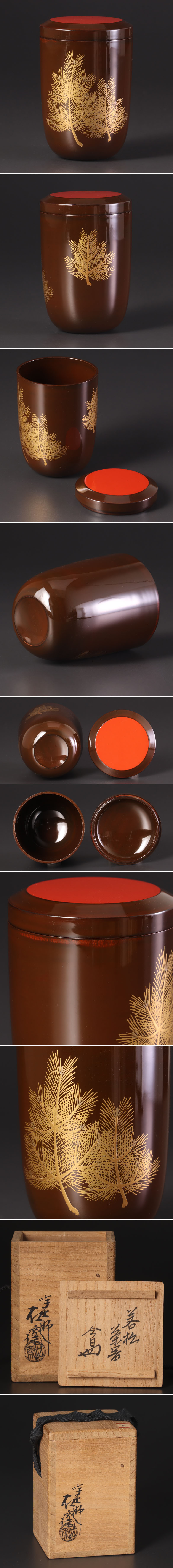 つややかなブラウンに若松の蒔絵が施され、朱とのコントラストも美しい作品です。 ★商品は辻石斎作、淡々斎書付の作品である事を保証致します。 |