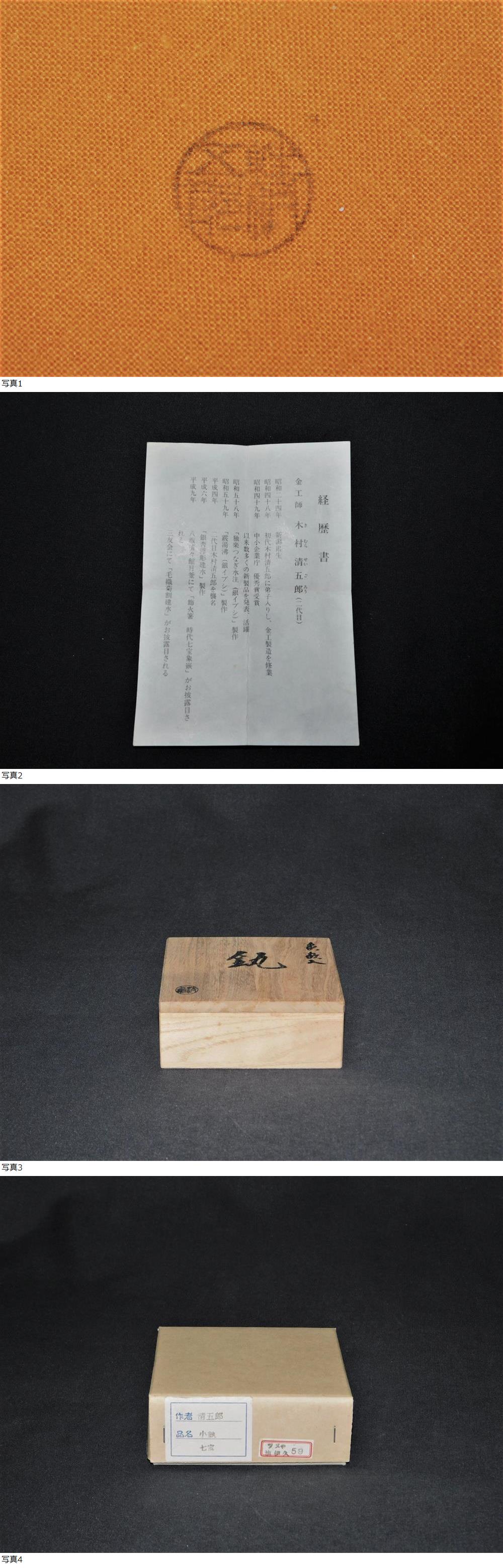 2代 木村清五郎作の釜鐶 象嵌入 七宝です。 一見してイタミ等ございませんが、 中古品の為、画像にてご判断の上、御入札ください。 状態は良好・美品です。 【寸法】 径8.2㎝、厚2.5㎝ 【付属品】 ■箱:共箱■共布:有■作歴:有■ こちらの商品は送料無料です。 発送は下記表を参考に佐川急便・ヤマト運輸からお選び下さい。 沖縄県に関してはヤマト運輸のみの取り扱いとなります。 また、梱包サイズが220以上の場合は佐川急便のみの取り扱いとなります。 同梱発送をご希望の場合は、ご連絡頂ければ対応させて頂きます。 只、梱包サイズが変更する場合もございます。 2代 木村清五郎 1949年 新潟県三条生 1973年 金属加工修練の後、 初代清五郎に金工製造を師事する。 1992年 2代目木村清五郎を襲名。 南鐐製品では清雲という号で襲名する。 金工・南鐐部門で市展で入選。 |