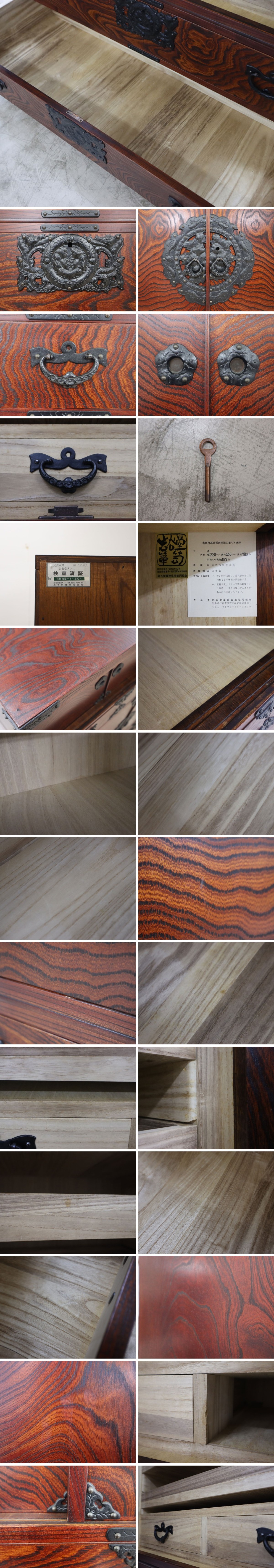 【商品説明】 岩谷堂箪笥(いわやどうたんす)は奥州藤原氏初代清衡公が産業を奨励した平安時代末期(1100年代)に始まり長い年月を経て今に伝わる岩手県を代表する伝統的な工芸品です。 欅の木目の美しさと、それを引き出す漆塗装に飾り金具を装飾した岩谷堂箪笥は、丹念で精巧に作られ、大切に使えば何百年も使い続けることが出来ます。 岩谷堂箪笥の特徴 [素 材] 岩谷堂箪笥に使われる材料は、欅・桐・栗・杉です。岩手県内では北上山系に良質の欅が多く、その明瞭な木理と強い材質から重厚 な家具が作られます。また、三陸地方の桐は特に「南部桐」と呼ばれる良材で、美しい肌理と狂いのない桐の特性が衣類を守ります。 [金 具] 岩谷堂箪笥の大きな特徴の一つは金具にあります。この金具には「手打ち手彫り」の物と南部鉄器金具の物と二種類あり、手打ち金 具はその一つ一つが金槌と鑢によって造られます。鮮やかに浮き彫りされた絵模様は堅牢さと共に家具としての風格を高めます。 [漆塗装] 岩手県は古くから我が国の代表する漆の産地で、平泉文化を華麗に装飾した漆塗装の伝統技術が岩谷堂箪笥に生きているのです。 漆塗りにはき木地呂塗りと拭き漆塗りの二つの方法があり、塗っては吹き、塗っては磨くという工程を6・7回も繰り返します。 |