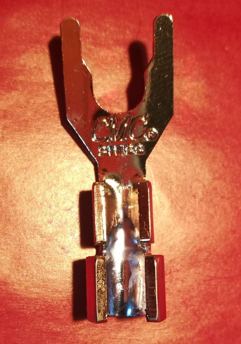 | ①CMCハイグレード純銅Y端子で24K金メッキが非常に綺麗です。 ②~4ミリ径及び8ミリ径端子まで取付可能な標準的Yラグです。 ③全長約38ミリ、外幅14ミリ、内幅6.2~8.9ミリ、厚み1.5ミリ。 ④熱収縮保護チューブ付で、バナナプラグの使用も可能です。 ⑤ケーブル接続用U字型溝は内径約4ミリと6ミリですのでカシメ方式や半田付けのほかバナナプラグの使用も可能です。バナナプラグ非対応端子でもこのYラグを端子に固定しておけばバナナプラグ対応になります。 ⑥半田接続の場合はU字型溝の金メッキを棒ヤスリ等で剥がして下さい。 厚い金メッキですので直接半田はできません。(参考画像ご参照下さい。) | |